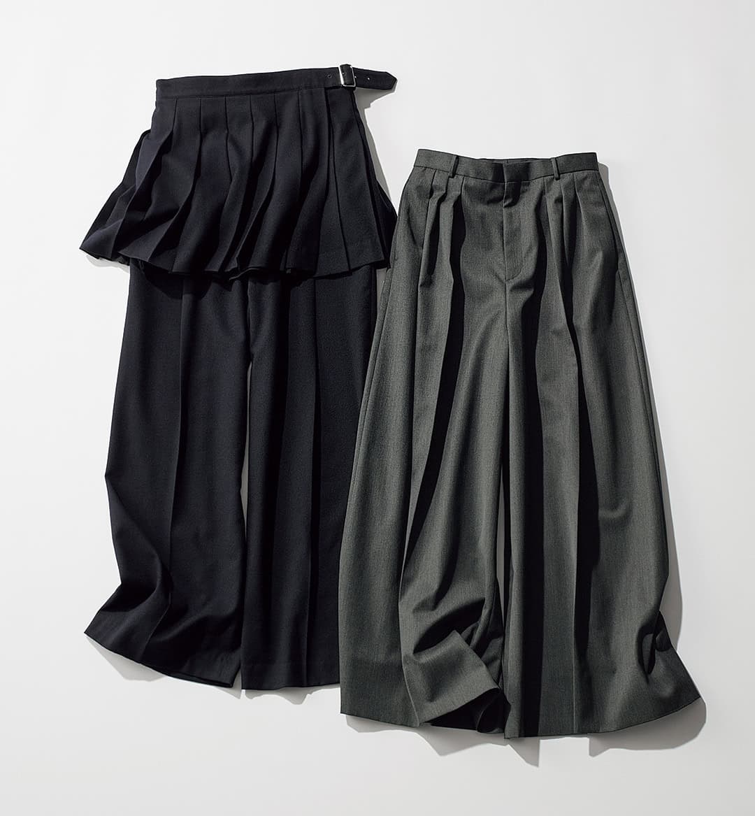 ドラマ感のある黒甘トップスは太タックパンツで受け止める
