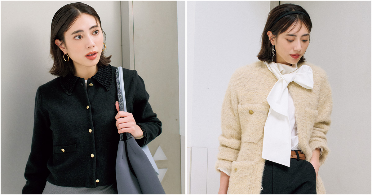 右・トップス¥5,980/ショッパーランド(ネクスト) カチューシャ¥7,700/ザ ヴァージンズ ネックレス¥55,000/スワロフスキー・ジュエリー(スワロフスキー・ジャパン) リング¥24,200/e.m.(e.m.青山店)