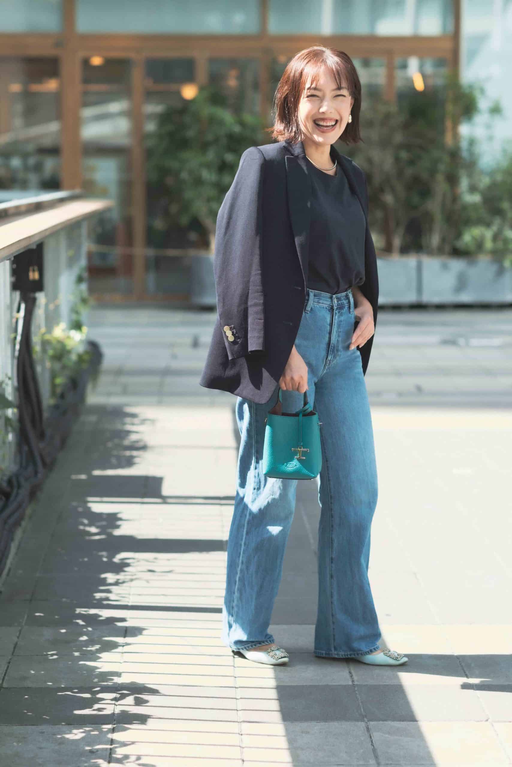 デニムジャケット¥49,500(イウエン マトフ/ユナイテッド アローズ 六本木ヒルズ店)ニット¥16,500(サロン アダム エ ロペ)パンツ¥64,900(アンスクリア/アマン)バッグ¥141,900(J&M デヴィッドソン/J&M デヴィッドソン カスタマーセンター)靴¥28,600(ダイアナ/ダイアナ 銀座本店)ピアス¥12,100(ワンエーアールバイウノアエレ/ウノアエレ ジャパン)サングラス¥49,500(DMY ストゥディオス/ザ・ウォール ショールーム)