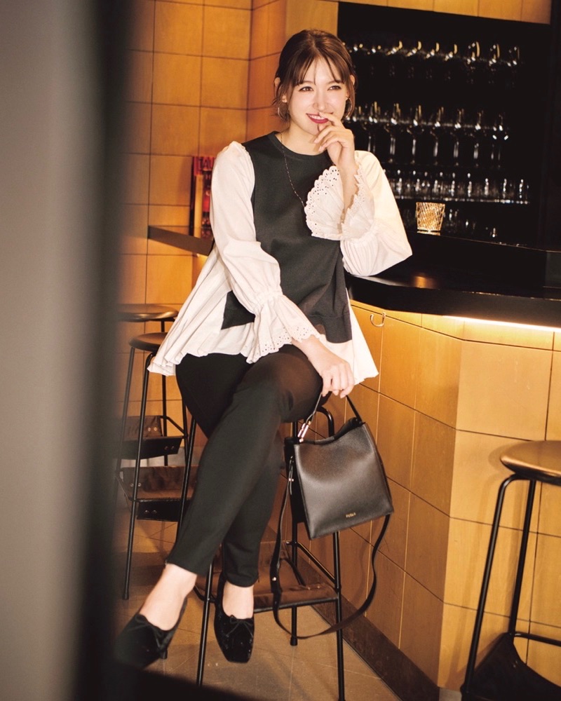 肩は骨っぽいパーツだからセクシーすぎず、むしろ女目線でおしゃれな高感度な肌見せに。仕事中はきちんと見える羽織りで露出をカバー。退勤後は女っぽい雰囲気に早変わり。