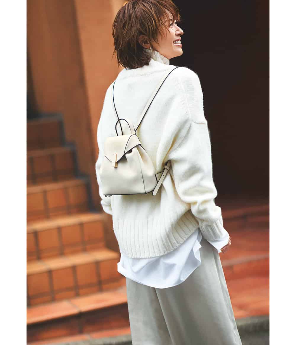 通年で使いやすいギンガムチェックは、特にこの時期活躍。トップスを白でまとめることで、夏の終わりも違和感なく、全体の印象が軽やかに。ターバンや素材感のあるカラーバッグをプラスして、感度の高い甘さを表現したい。