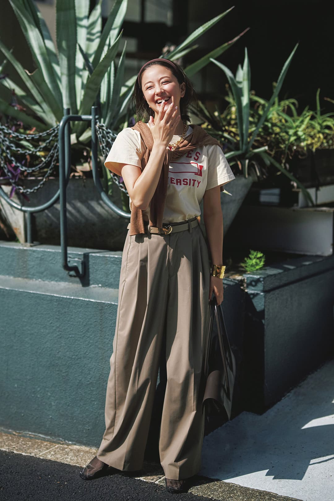 日中の屋外なら、Tシャツ1枚でもちょうどいいぐらいの気温。でもカラーを旬なブラウンでまとめれば、秋らしさも今っぽさも両得。薄手のカーデを肩掛けして、気温差と真夏見えの対策を。タックパンツを合わせれば、カジュアルなロゴTもキレイめにシフトできます。