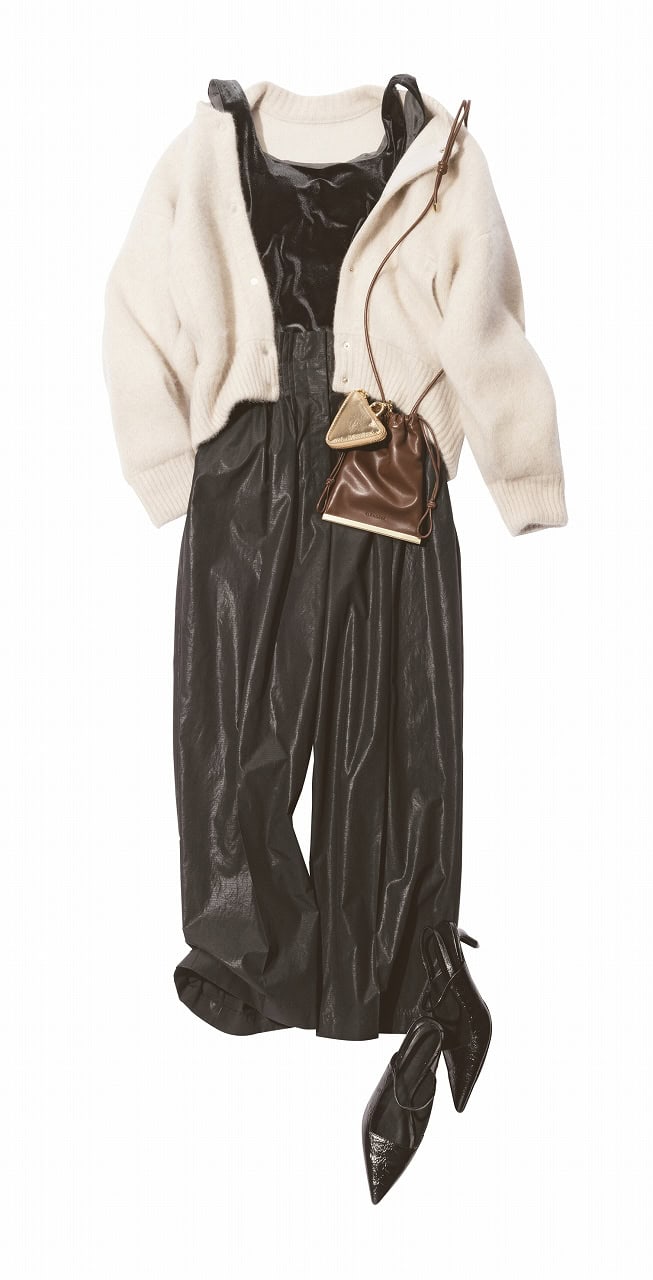 カーディガン¥38,500 ベロアパッドタンクトップ¥13,200 ウエストピンタックパンツ¥26,400 マルチショルダーバッグ¥13,200 ポインテッドトウミュール¥20,900(すべてELENDEEK)アクセサリー(スタイリスト私物)