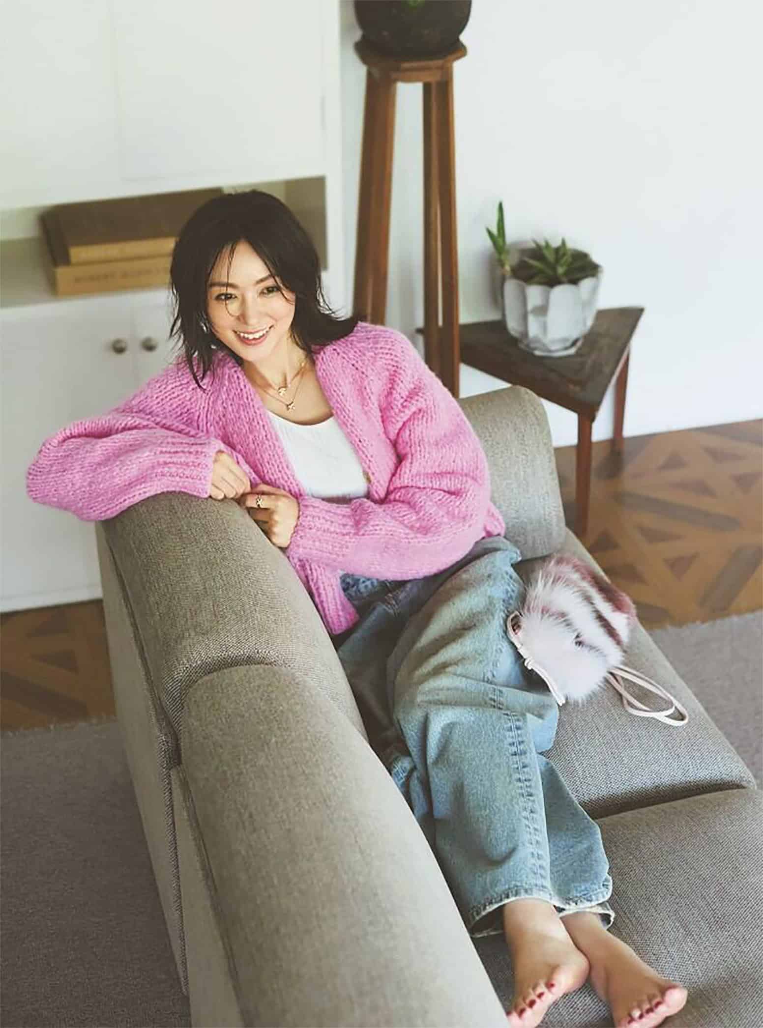 カーディガン¥46,200〈ウィム ガゼット〉パンツ¥46,200〈ゲミニー〉(ともにウィム ガゼット 玉川髙島屋S・C店)「リアン」コレクション ネックレス 上[ジュ ドゥ リアンハーモニー ペンダント]〈PG×DIA〉¥495,000ネックレス 下[ジュ ドゥ リアン ペンダント]〈PG×DIA〉¥415,800リング[ジュ ドゥ リアン リング]〈PG×DIA〉(すべてショーメ)その他スタイリスト私物