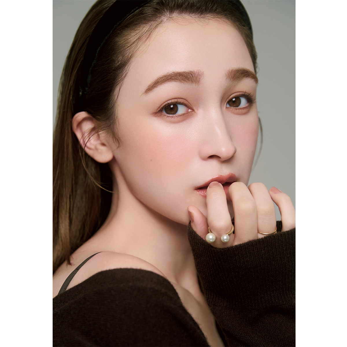 ワンピース¥34,000(シーニュ)カーディガン¥75,900(デミリー/リトルリーグ インク)カチューシャ¥26,400(アレクサンドル ドゥ パリ/アレクサンドル ドゥ パリ GINZA SIX店)リング(スタイリスト私物)