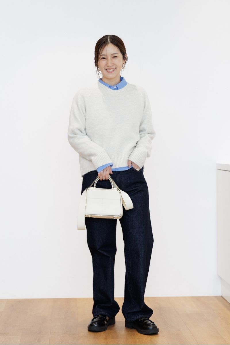 オックスフォードシャツ¥3,990 ストレートジーンズ¥4,990(すべてユニクロ アンド ジェイ ダブリュー アンダーソン/ユニクロ)スフレヤーンクルーネックセーター¥3,990(ユニクロ)コンフィールタッチローファー¥3,990(ユニクロ:シー/ユニクロ)・その他本人私物
