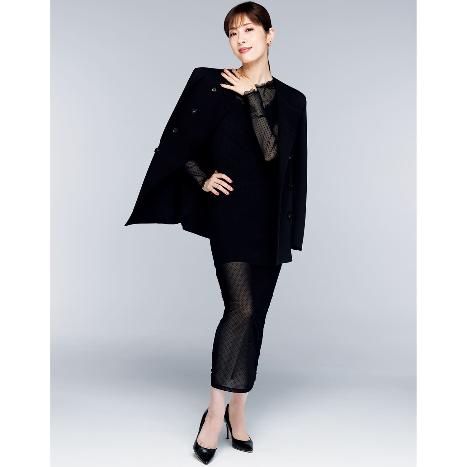[写真1枚目]ワンピース ¥75,900(リヴィアナ コンティ/イザ)イヤリング ¥96,800(ケンゴ クマ プラス マユ/ヴァンドームヤマダ)ブレスレット ¥72,600 リング ¥209,000(ともにヴァンドーム青山/ ヴァンドーム青山本店)[写真2-4枚目]ジャケット ¥121,000(リヴィアナ コンティ/イザ)ワンピース ¥45,100(オールセインツ/オールセインツ ジャパン)イヤリング ¥148,500 リング ¥139,700(ともにヴァンドーム青山/ヴァンドーム青山本店)パンプス/スタイリスト私物