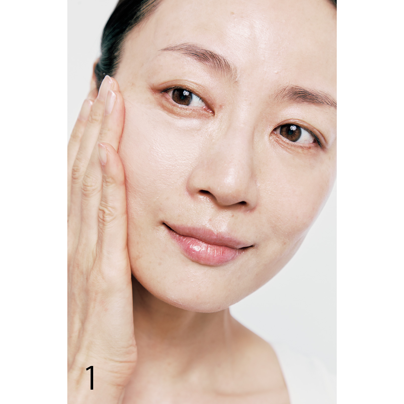 最新の薄膜ファンデは定着力が高いため、5点置きよりパーツごとに仕上げて。指の第二関節までを使い内から外に向かって広範囲に一気に伸ばせば、薄く均一にフィット。