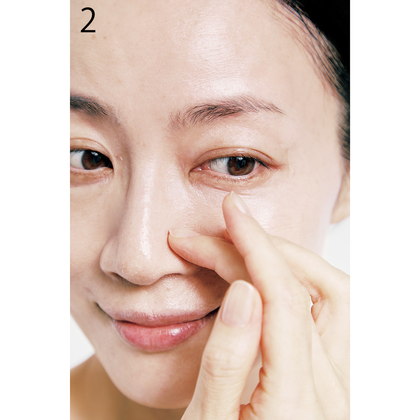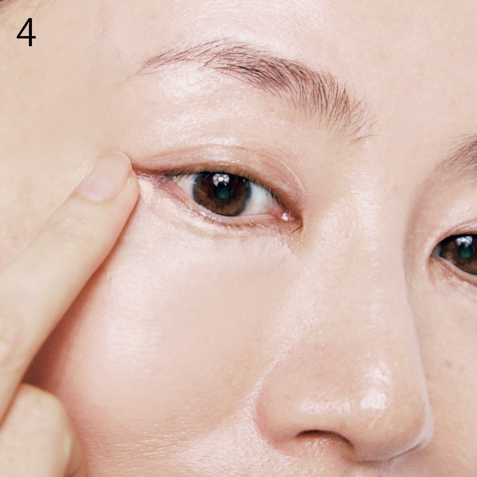 最後に目周りを丁寧に整えます。シワの向きと逆方向=目尻から目頭に向かって指でトントンとやさしく馴染ませて。スポンジで整えると定着力とカバー力が高まります。