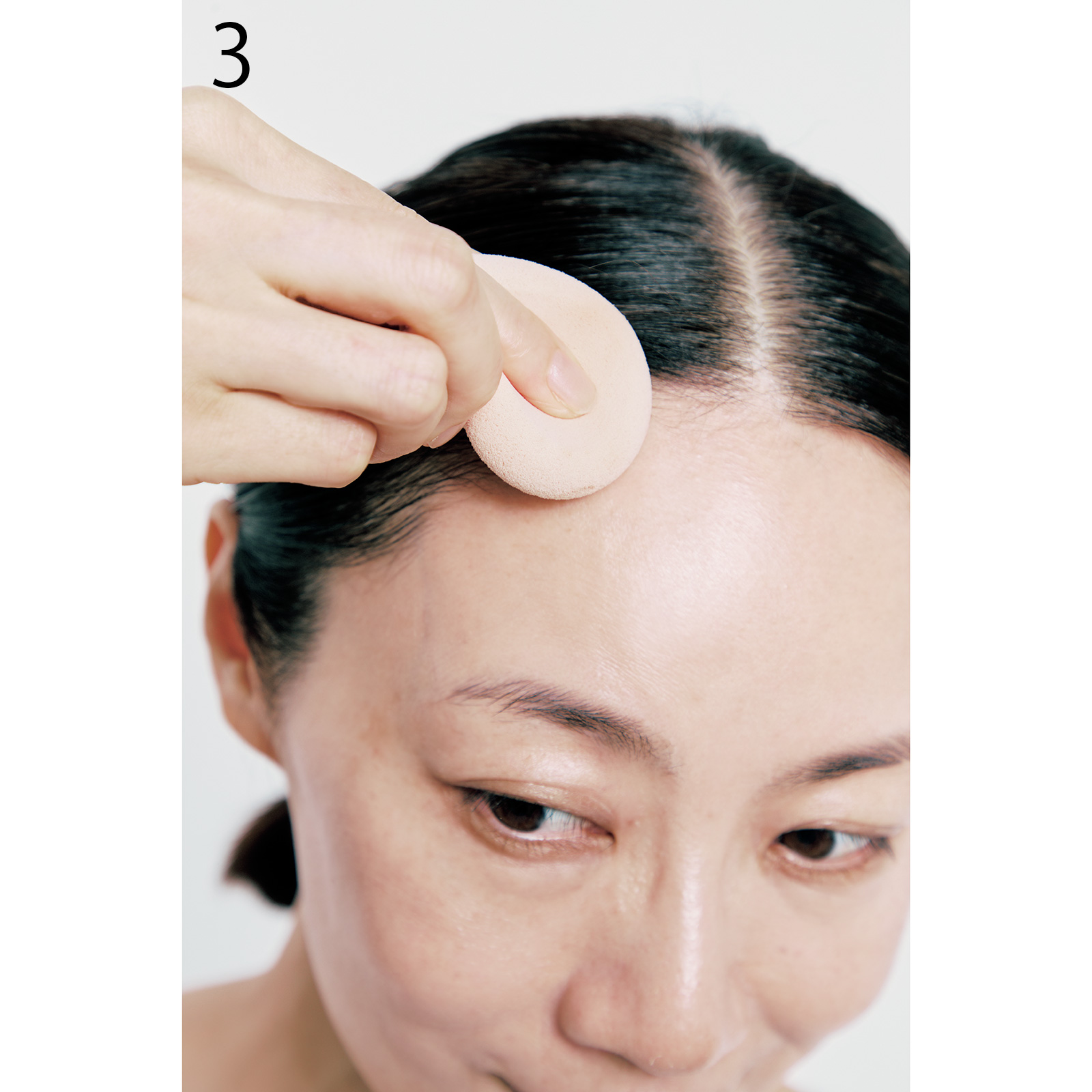 スポンジで整える最後のひと手間で、塗りムラを防ぎ、メイクの密着力も高めて薄膜肌がランクアップ。額の生え際や耳周りまで馴染ませることも忘れないで。
