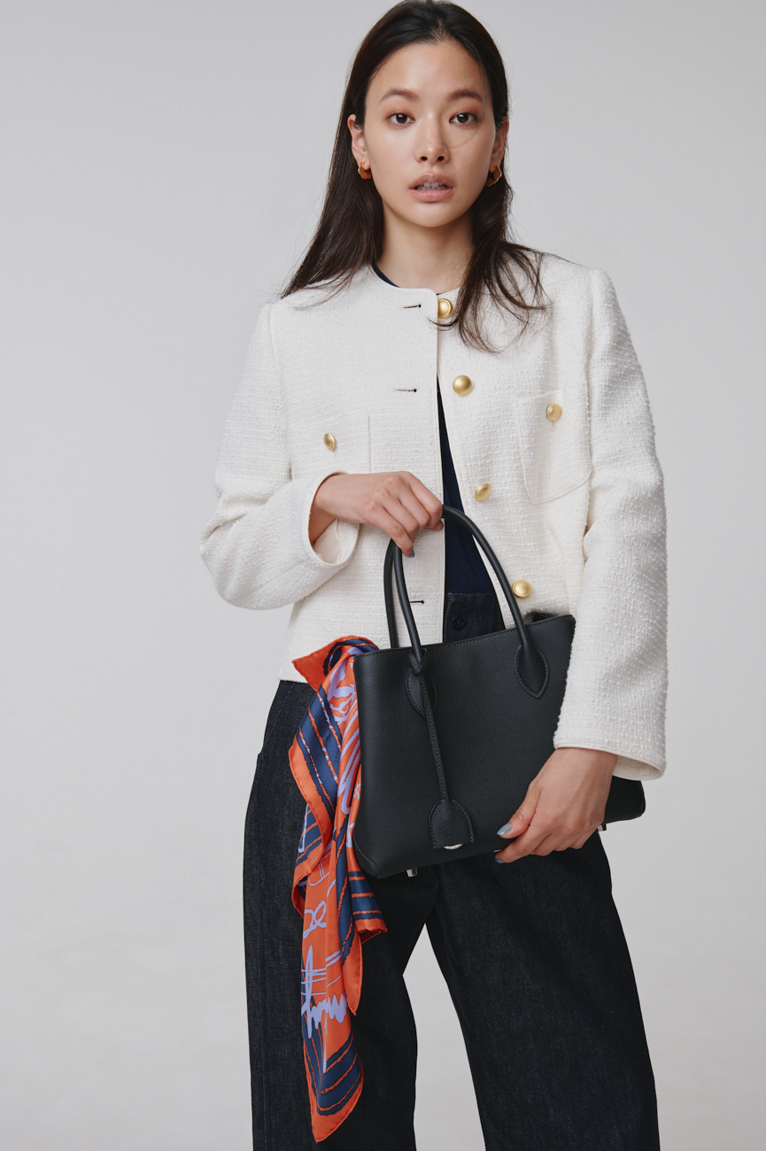 ゴールドボタンのツイードジャケットにダークデニムを合わせた、上品さと抜け感を両立する装い。柔らかなスクエアフォルムの黒トートを添えれば、甘さのあるジャケットも大人っぽく引き締まります。撥水仕様で天候を選ばず使え、デイリーに頼れる一品です。バッグ「ミアトートバッグ30」¥209,000(ボナベンチュラ)