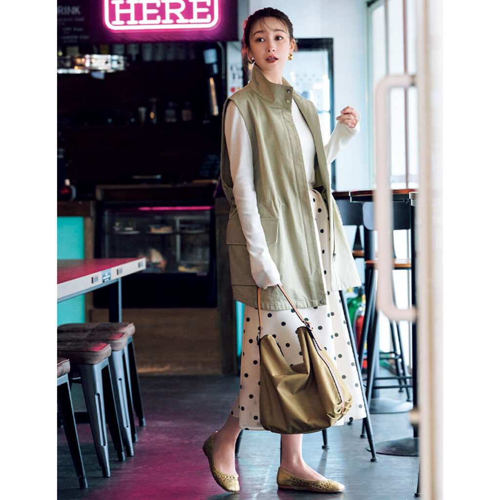 カーキのジレにドット柄スカートを合わせた大人可愛いスタイルには、レザートリミングのバッグをON。ナイロン素材だから軽やかに持てて、気負いのない雰囲気に仕上がります。足元はメタリックなフラットシューズで遊び心を加え、働く日の装いを今っぽくアップデート。バッグ¥26,900(トゥティエ)