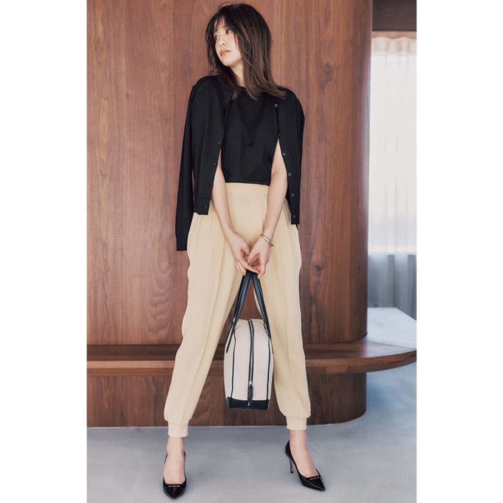 黒のカーディガン×ベージュパンツのきれいめコーデに、キャンバス地のスクエアバッグを合わせて抜けをひとさじ。黒のレザートリミングが効いているから、軽やかな素材感でもきちんと見えが叶います。ヒールパンプスを添えれば、通勤やミーティングシーンにも対応できる上品なオフィスカジュアルに。バッグ¥52,800(ヴァジック)
