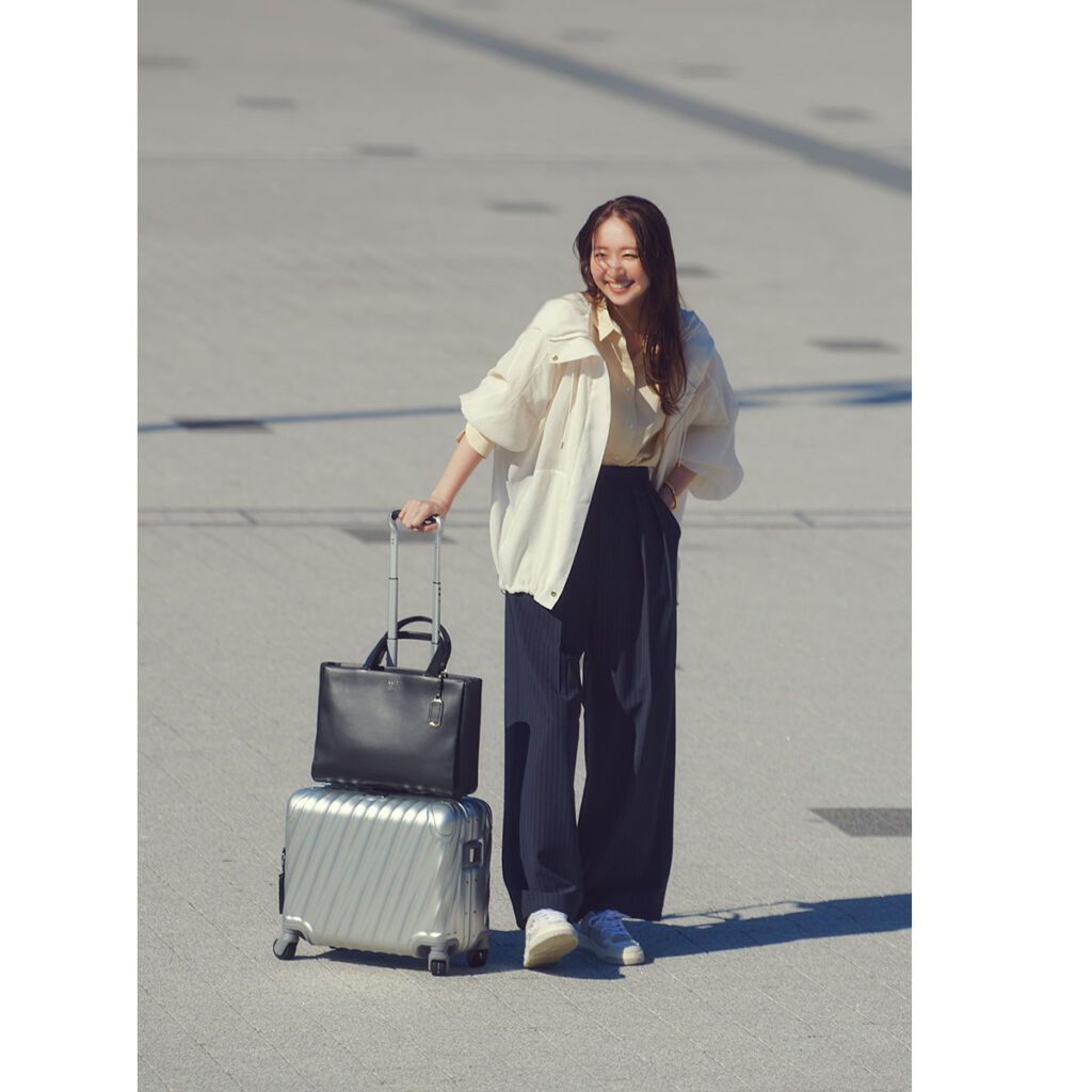 スーツスタイルにもオフィカジにも合う端正なルックスの黒トートは、出張や通勤に欠かせない相棒。どんなスーツケースともなじむシンプルさで、移動シーンもスマートに。ワイドパンツ×スニーカーのカジュアルな装いもきりりと引き締めて、大人のトラベルコーデに仕上げてくれます。コンパクトキャリーオン¥198,000“ヴェイル”ミディアムトートバッグ¥121,000(ともにトゥミ)
