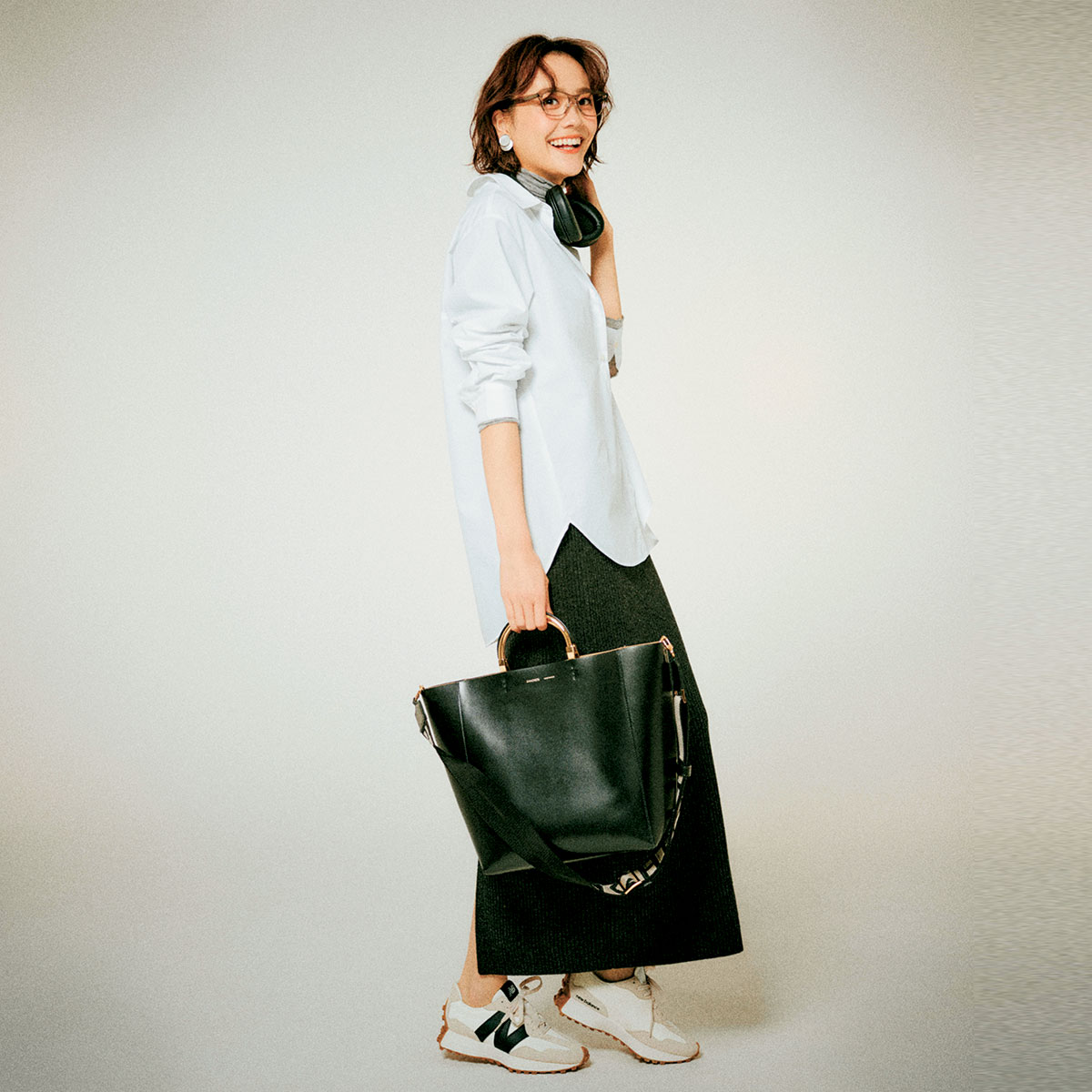 PCも資料もすっきり収まる大きめ黒トートを主役にすれば、スニーカー合わせの軽快な装いも通勤スタイルにシフト。黒スカートで縦のラインを強調しつつ、オーバーシャツで大人の余裕を演出します。手持ちにもショルダーにもできる2WAY仕様だから、外回りや移動が多い日でも快適!バッグ¥143,000(ザンケッティ)