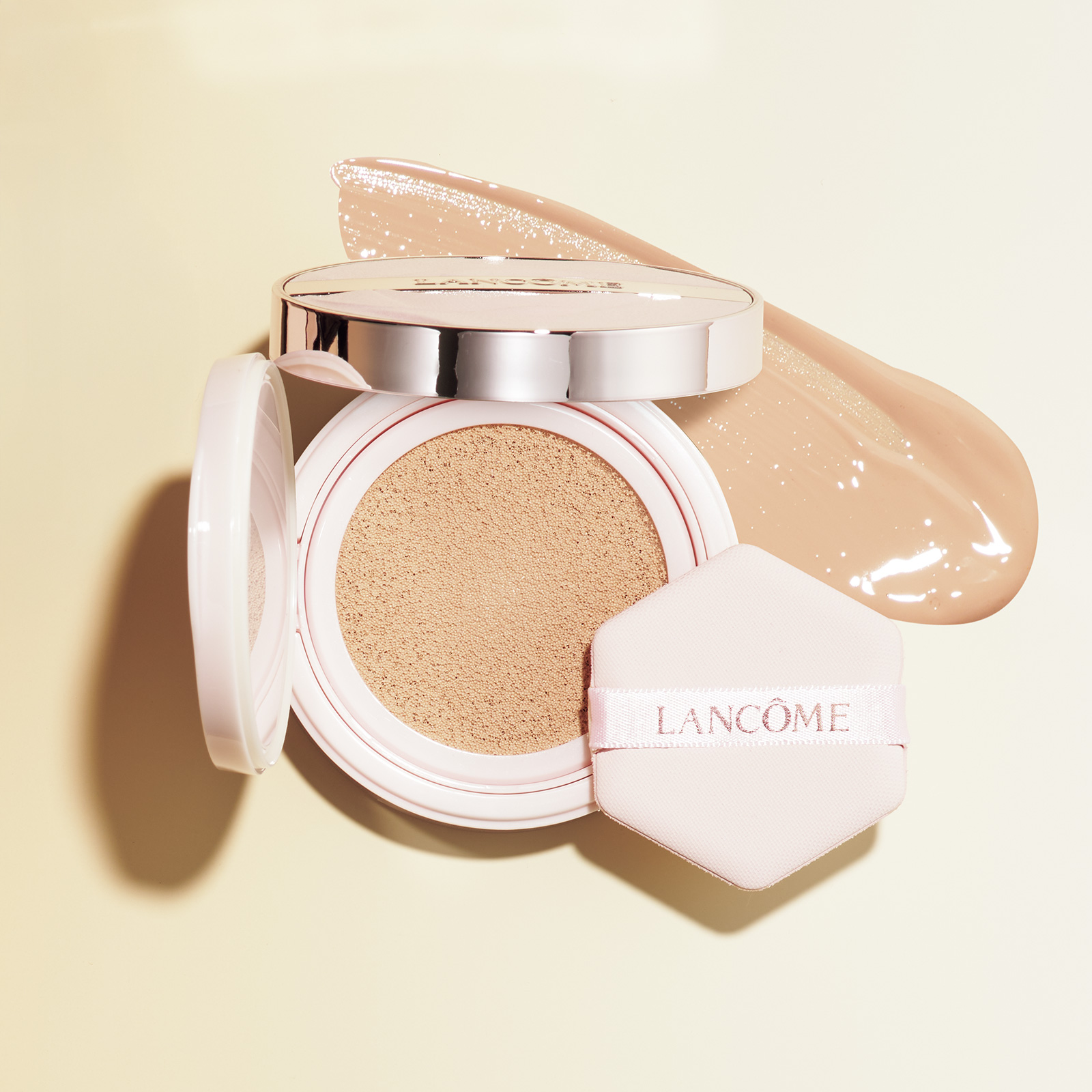 美容液ベースで24時間潤いが続き、乾燥による崩れも軽減。新形状のパフは六角形で細かい箇所も塗布しやすい。全4色。¥7,920(ランコム)<公式サイトをチェック>