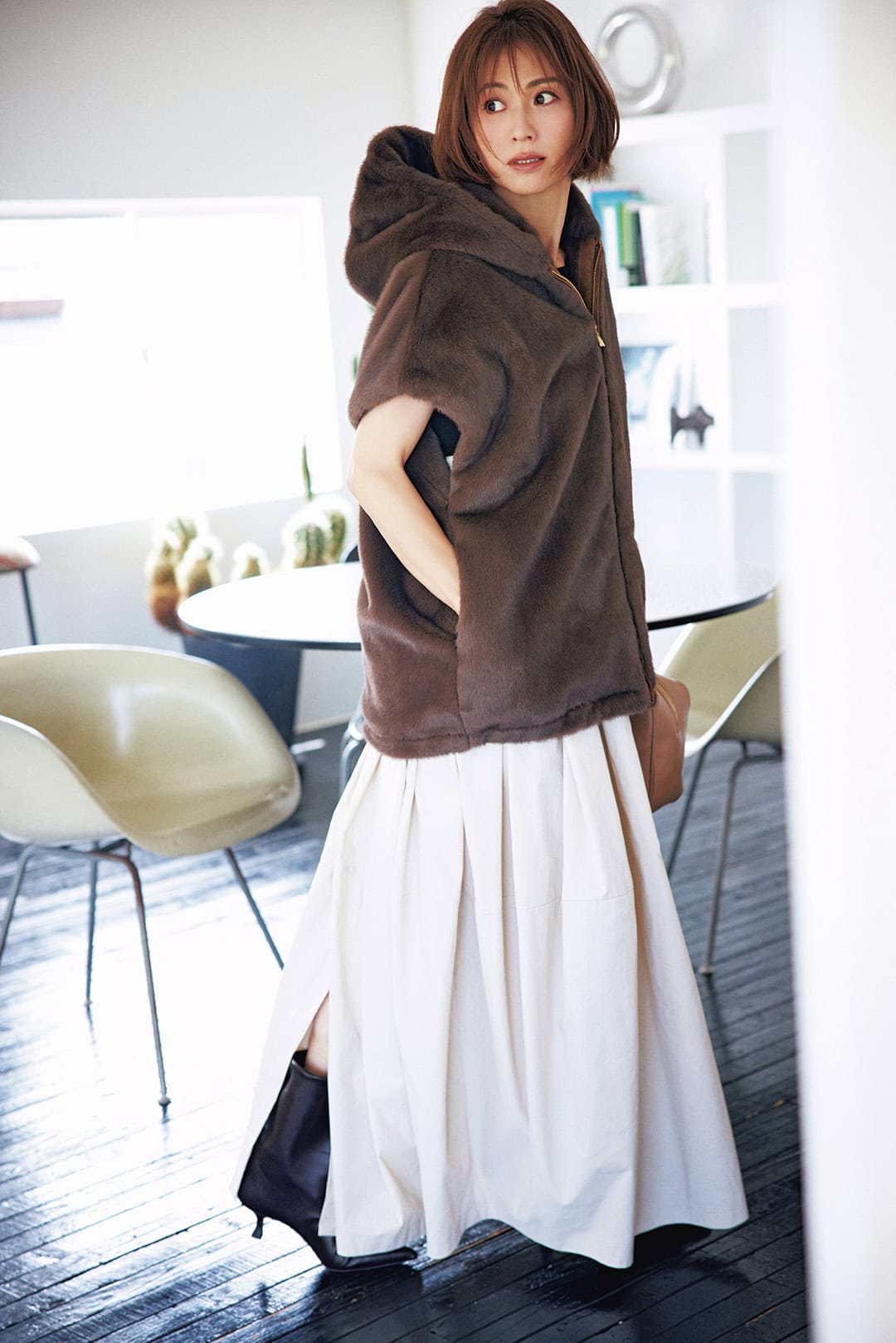 昨年ライター陣にも大人気だったファーベストが今年も登場。見た目も触り心地もまるでミンクの高級感が大人の品格にマッチ。スリーブレスの抜け感で着膨れも回避でき、ボリュームのあるワンピとも好相性です。フーディのカジュアル感でファーでもゴージャスになりすぎないうえ、スリーブレスだからこそインナー次第で寒暖差もコーデのアレンジも楽しめる。