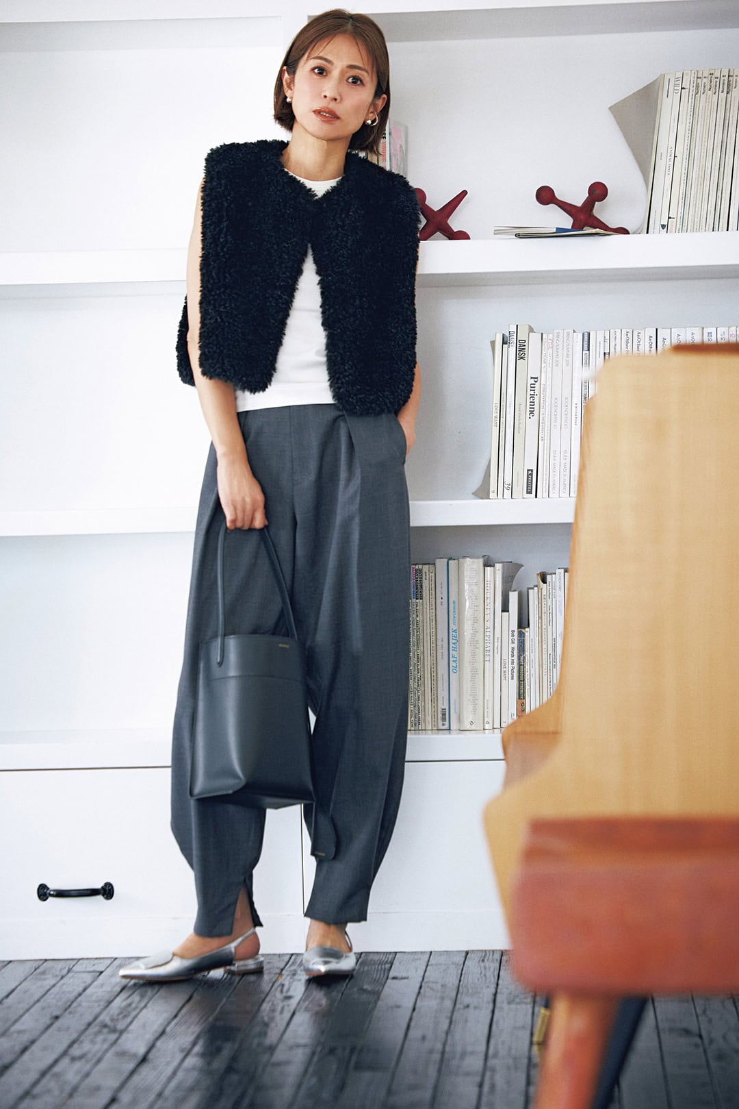 畑野さんも実際に愛用しているジレ。コートの上に着るレイヤードも可愛いとの声もあり、スリーブレスながら長く着られる。モード感のあるバレルパンツで下にボリュームを出すと好バランス。デイリーな着こなしにも羽織れば 洒落見えする救世主。