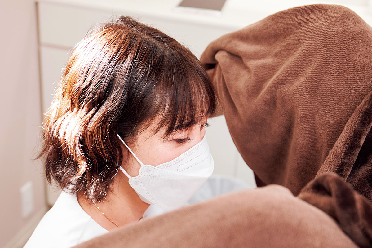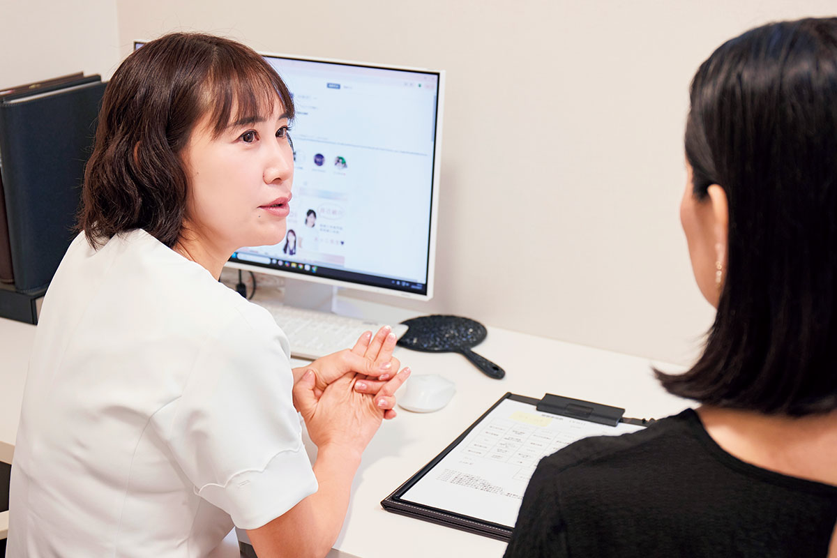 クリニック到着後、問診表を記載したらスタッフと個室でカウンセリング。診察当日の体調確認や問診表に記載した症状についてやさしく確認されます。まとめた内容は詳細にカルテに入力され、医師に引き継がれます。