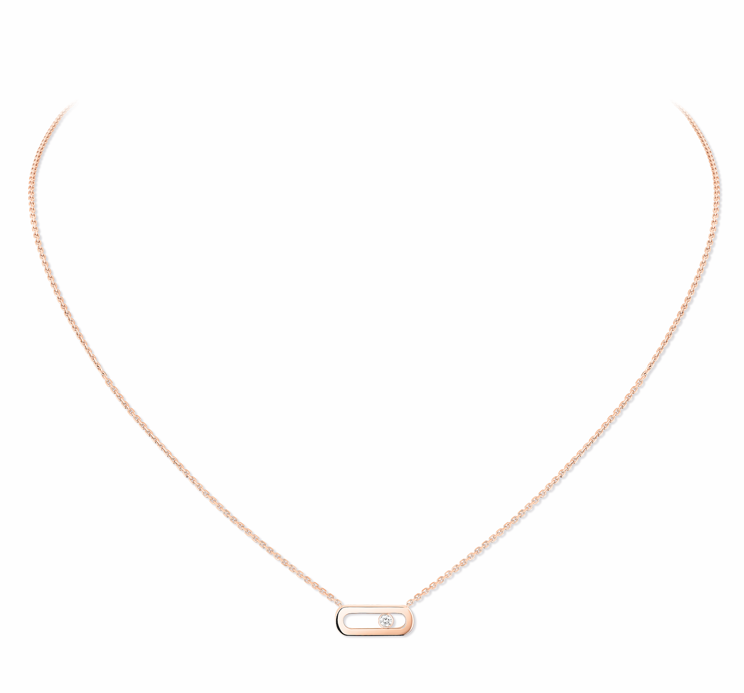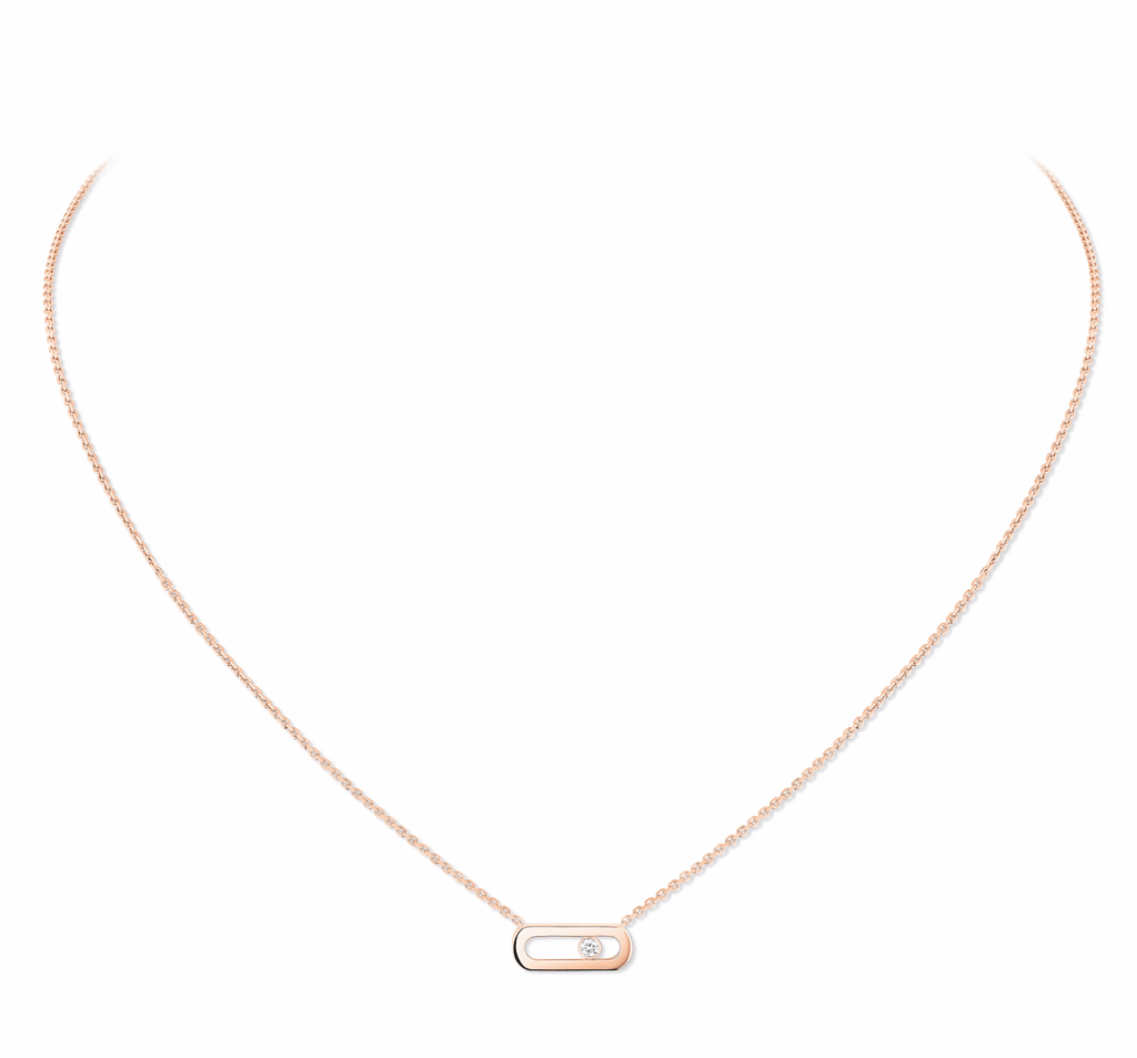 その名の通り、ブリリアントカットのダイヤモンドが身に着ける人の動きに合わせて移動する、メゾンの人気コレクション「ムーヴ」。シンプルな楕円形のゴールドの間で、ダイヤモンドが動き煌めくデザインは、シンプルながら遊び心に溢れ、胸もとに華やかな表情をプラス。着ける人、装い、シーンを選ばず、毎日に寄り添ってくれるネックレスです。