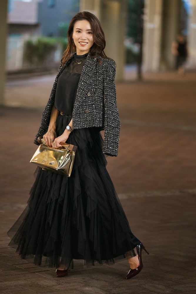 【ツイードジャケット】×チュールスカートで、一目置かれるほぼ黒コーデに