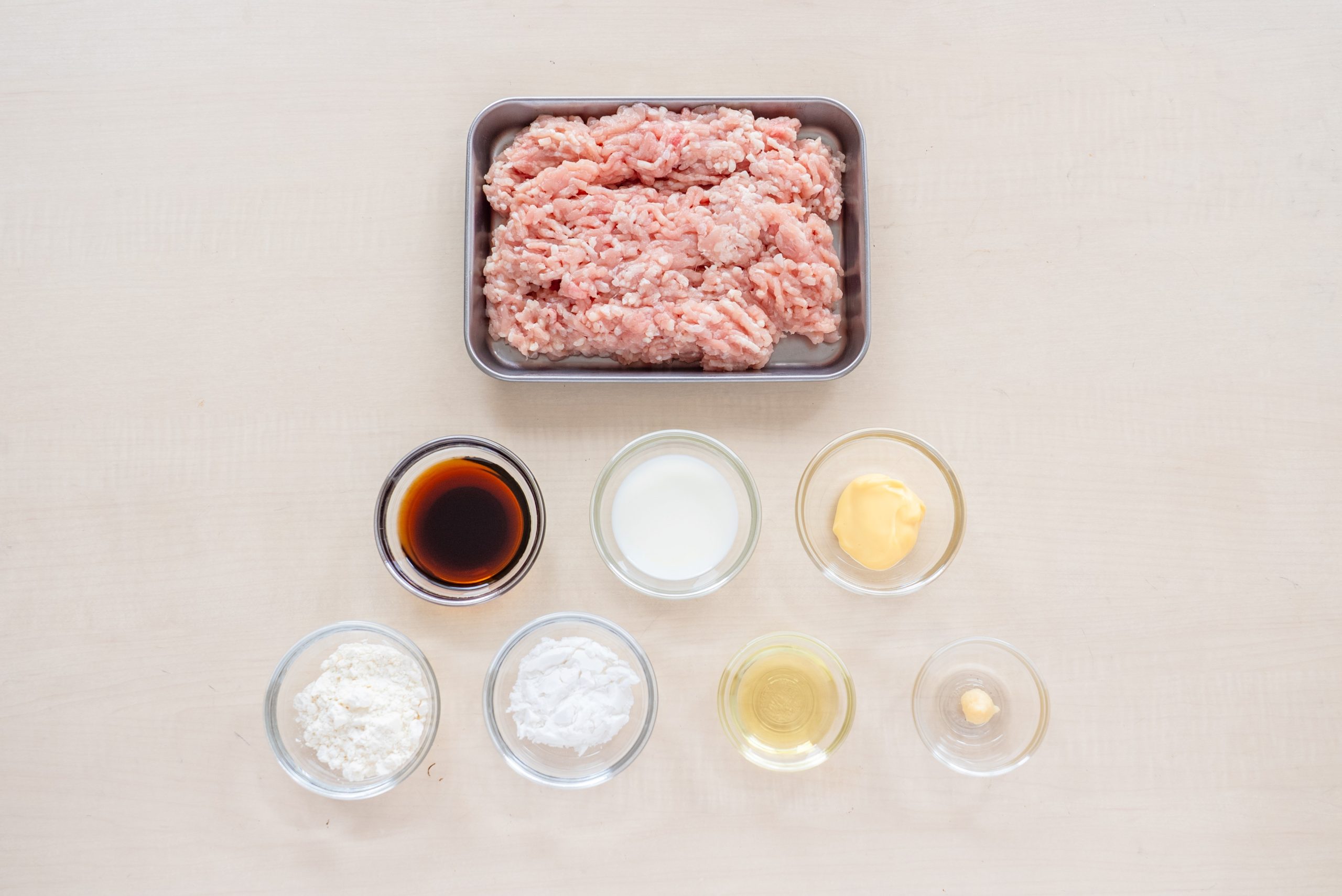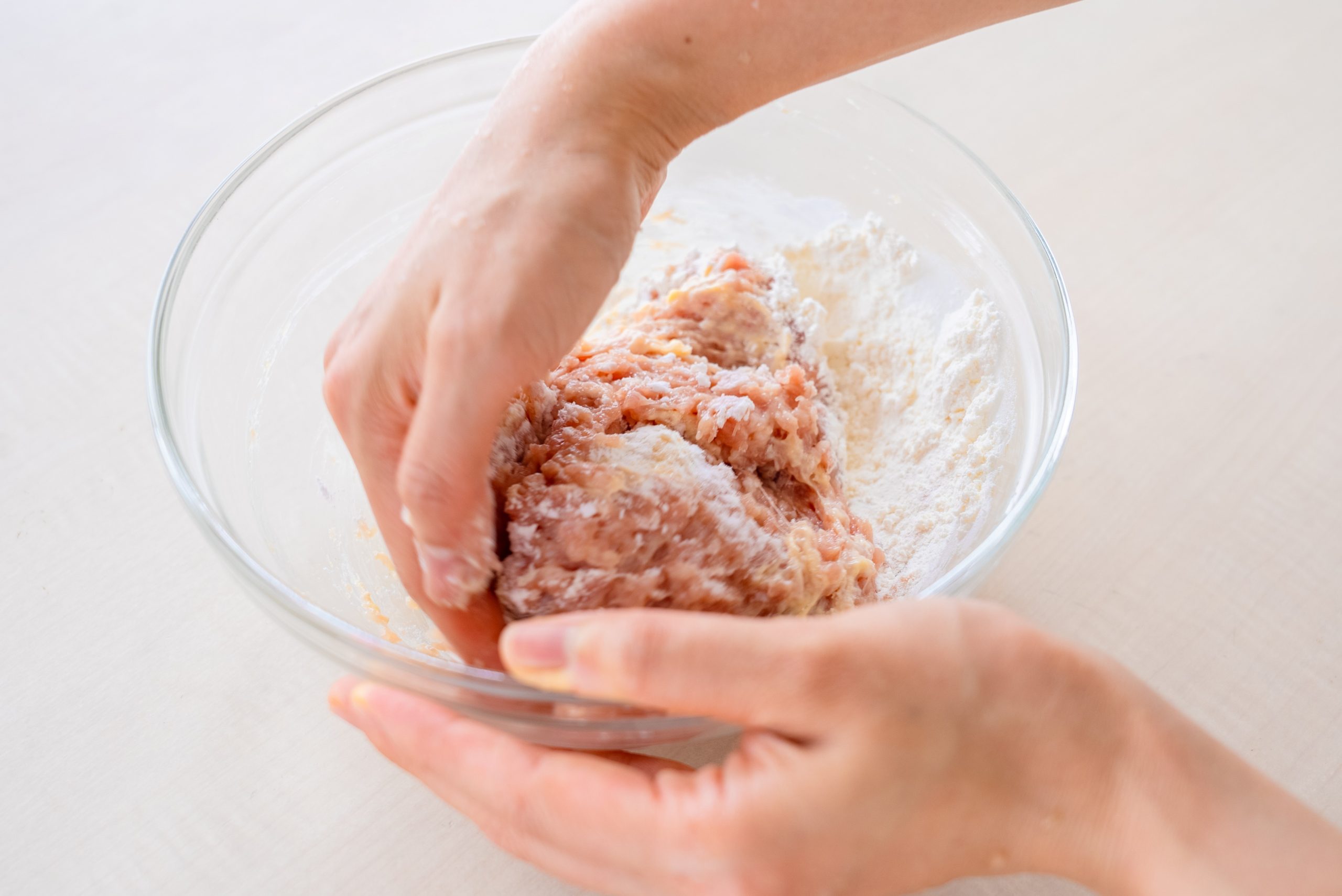 ①ボウルに鶏ひき肉を入れ、めんつゆ、牛乳を加えて混ぜ合わせる。