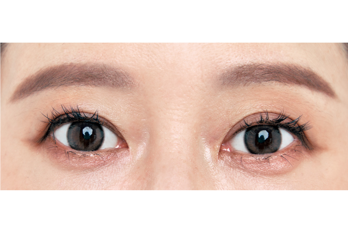 眉頭の2㎜外側から描き始め、両眉の距離を広げ、眉尻は目幅より長く描きます。シアーカラーのマスカラで立体感を出し、優しい目ヂカラを。