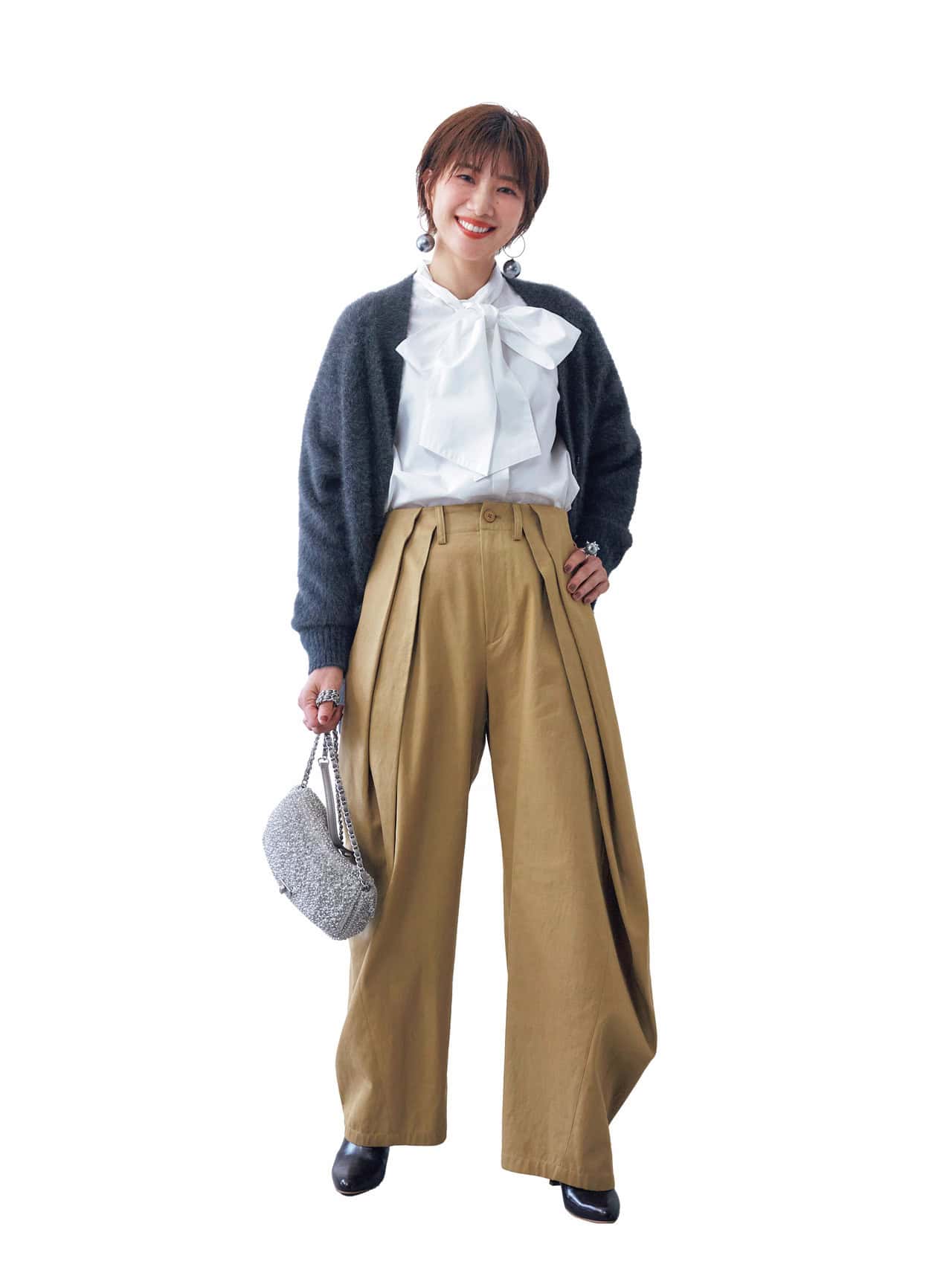 パンツ¥17,600(カデュネ)カーディガン¥27,940(ネイヴ/ネイヴ〈オンワード樫山〉)ブラウス¥17,600(ヘルシーデニム/ゲストリスト)バッグ¥42,900(ヴァジック/ヴァジックジャパン)シューズ¥24,200(オデット エ オディール/オデット エ オディール 新宿店)ピアス¥19,800(リューク)