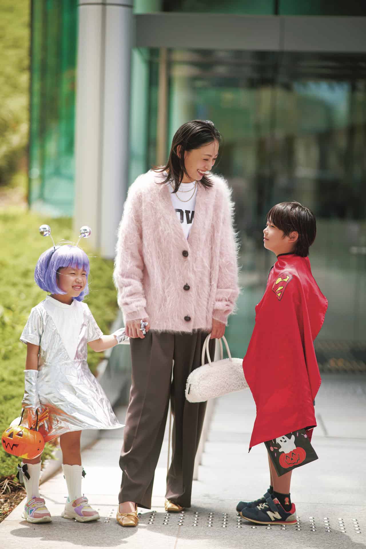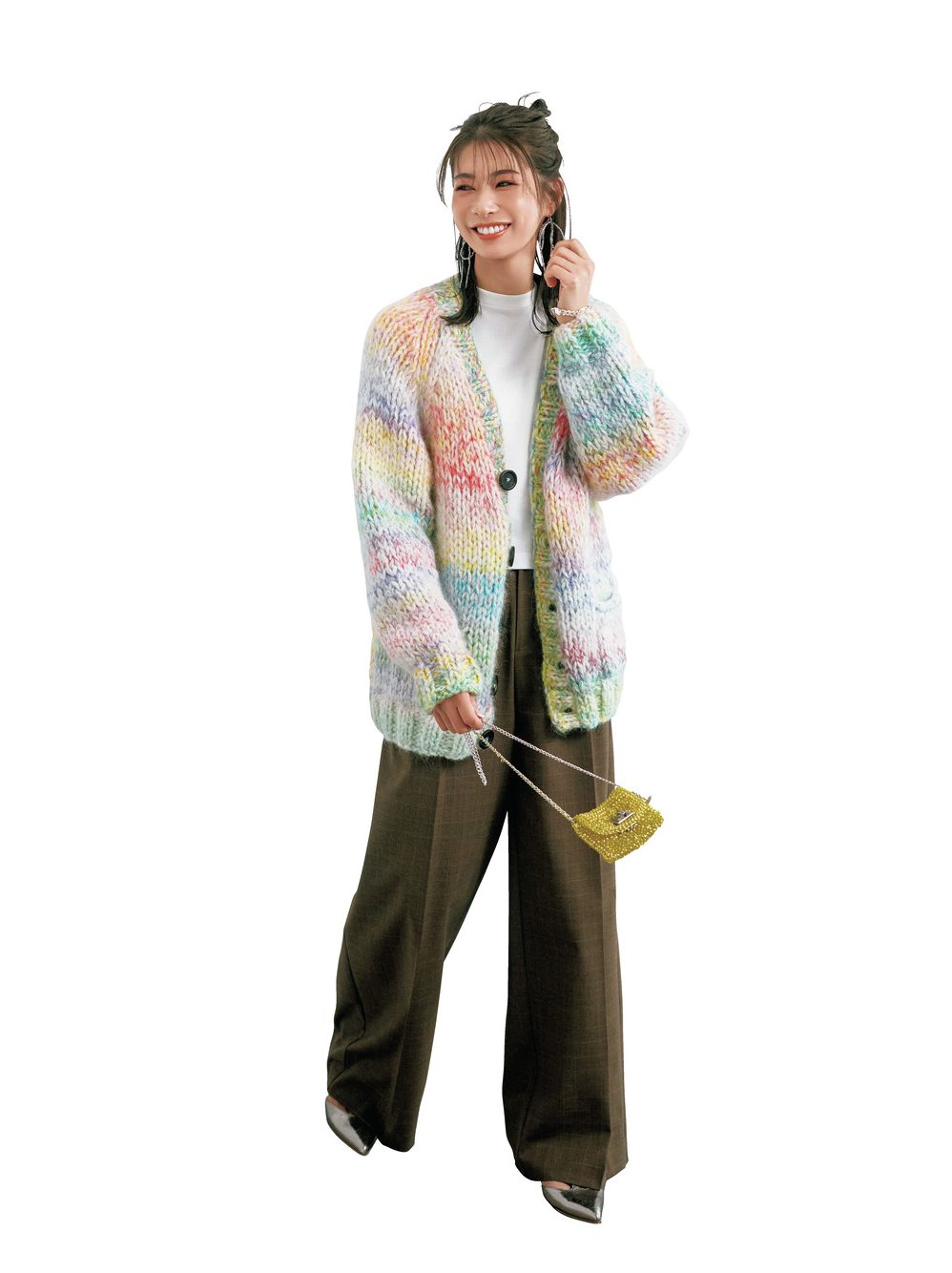 カーディガン¥97,900(カオス/カオス丸の内)カットソー¥12,980(チャンピオン/ヘインズブランズ ジャパン カスタマーセンター)パンツ¥33,000(アストラット/アストラット 新宿店)バッグ¥14,300(ツル バイ マリコ オイカワ)パンプス¥40,700(チェンバー/クルーズ ショールーム)ピアス¥30,800(ココシュニック)ネックレス¥44,000(ブランイリス/ブランイリス トーキョー)