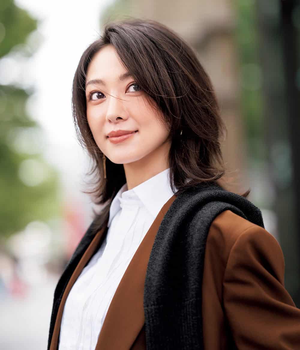 ジャケット¥139,700パンツ〈ベルト付き〉¥52,800(ともにマッキントッシュ/マッキントッシュ 六本木ヒルズ店)シャツ¥70,400(セブリン/アマン)肩にかけたカーディガン¥25,300(ザ シンゾーン/シンゾーン 表参道本店)バッグ¥157,300 パンプス¥155,100(ともにピエール アルディ/ピエール アルディ東京)ピアス¥12,100ブレスレット¥12,100リング¥13,200(すべてワンエーアールバイウノアエレ/ウノアエレ ジャパン)
