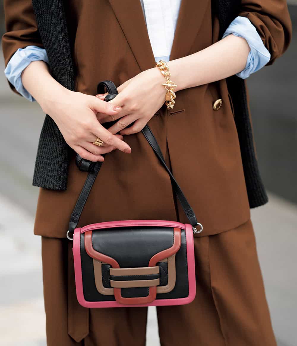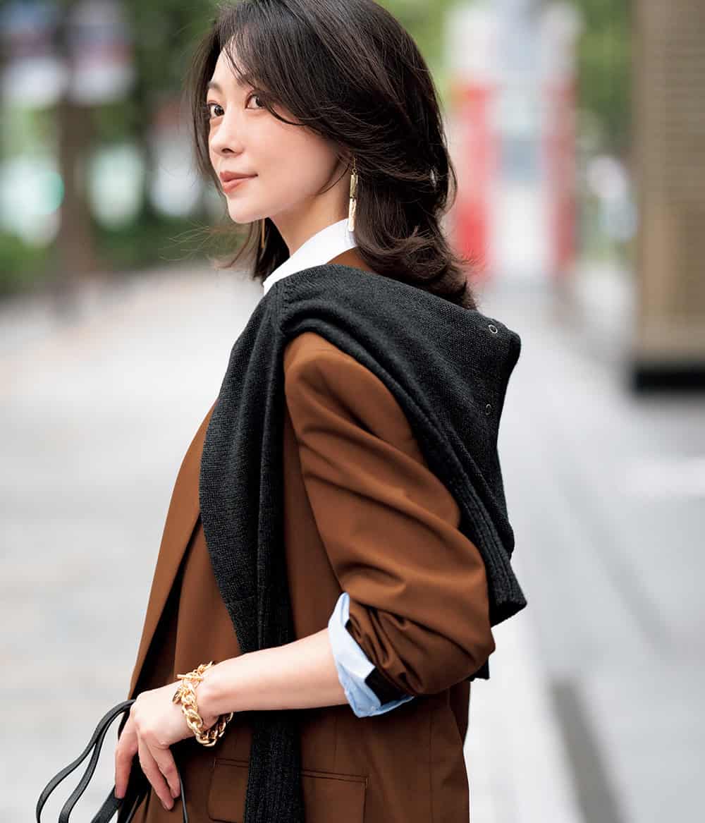 今季注目の赤みブラウンで今っぽさときちんと感を両立。カーデの肩掛けや効かせ色のバッグで、ジャケパンセットアップを華やかにひと盛り。「街で浮かない色だから、自分的にもしっくりくるトレンドとして受け止められそう」とモデル徳澤さん。