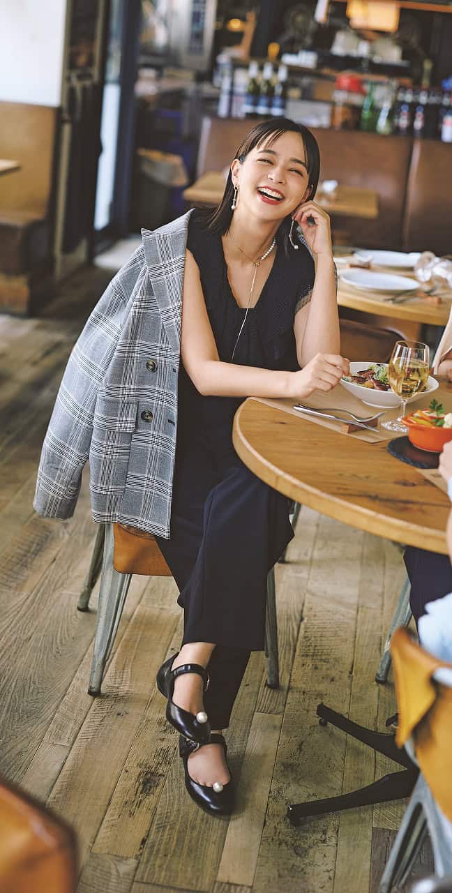 シューズ¥13,200(プーマ/プーマ お客様サービス)ジャケット¥25,300(マルゥ ユナイテッドアローズ/ユナイテッドアローズ カスタマーサービスデスク)ワンピース¥24,200(MIESROHE/MIESROHE ルミネ新宿1店)バッグ¥75,900(メアリ オル ターナ/AL Design Inc.)ピアス¥36,300(ブランイリス/ブランイリス トーキョー)ネックレス¥39,160(ソコ/ズットホリック)