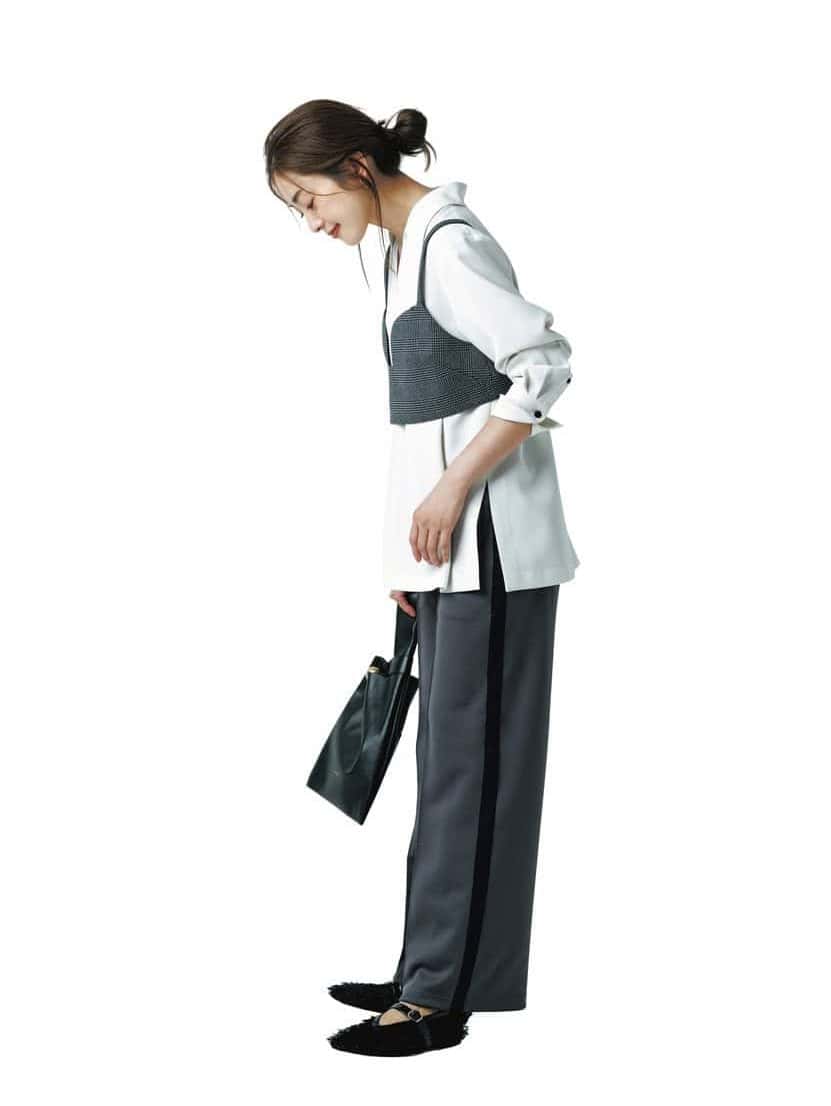 ビスチェ×シャツ[セット販売]¥59,400(アドーア)パンツ¥29,700(アストラット/アストラット 新宿店)バッグ¥42,900(オルセット/オルサ)パンプス¥45,100(ヒューン/クルーズ ショールーム)キャップ¥4,620(ニューエラ)ピアス¥14,740(エムシー・スタジオ/ズットホリック)