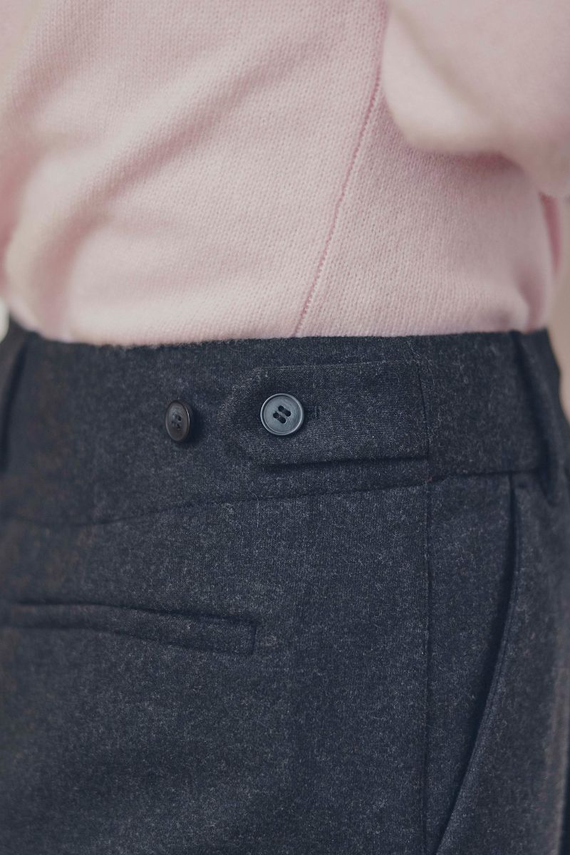 ほんのり起毛したジャージー素材が包み込むように温かいバレルレッグパンツ。ウエストに調整ボタン付きで、トップスのイン・アウトどちらにも対応します。リラックスしたシルエットながら、ウエスト位置を高く見せる絶妙設計で美脚効果も。足首がほんのり見える少し短めの着丈なので動きやすく、子どもと遊ぶ日も便利。ショートブーツでも白ソックスでも、上品にキマる一本です。