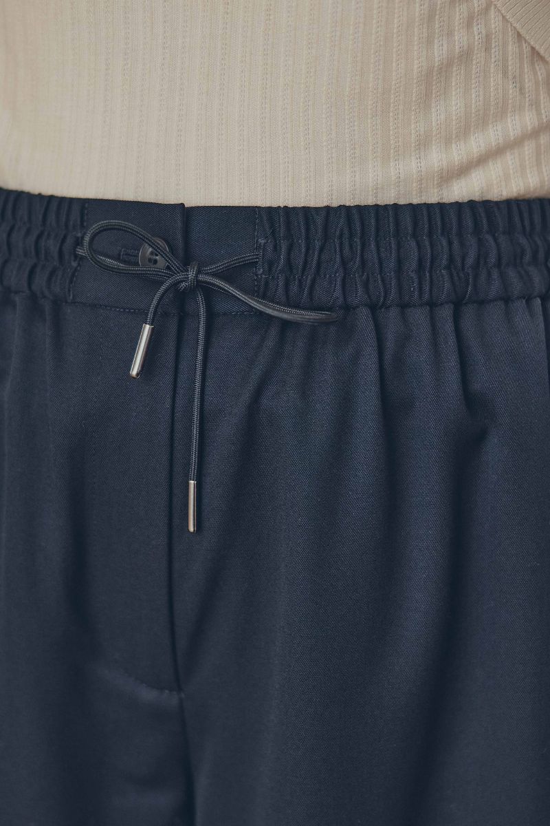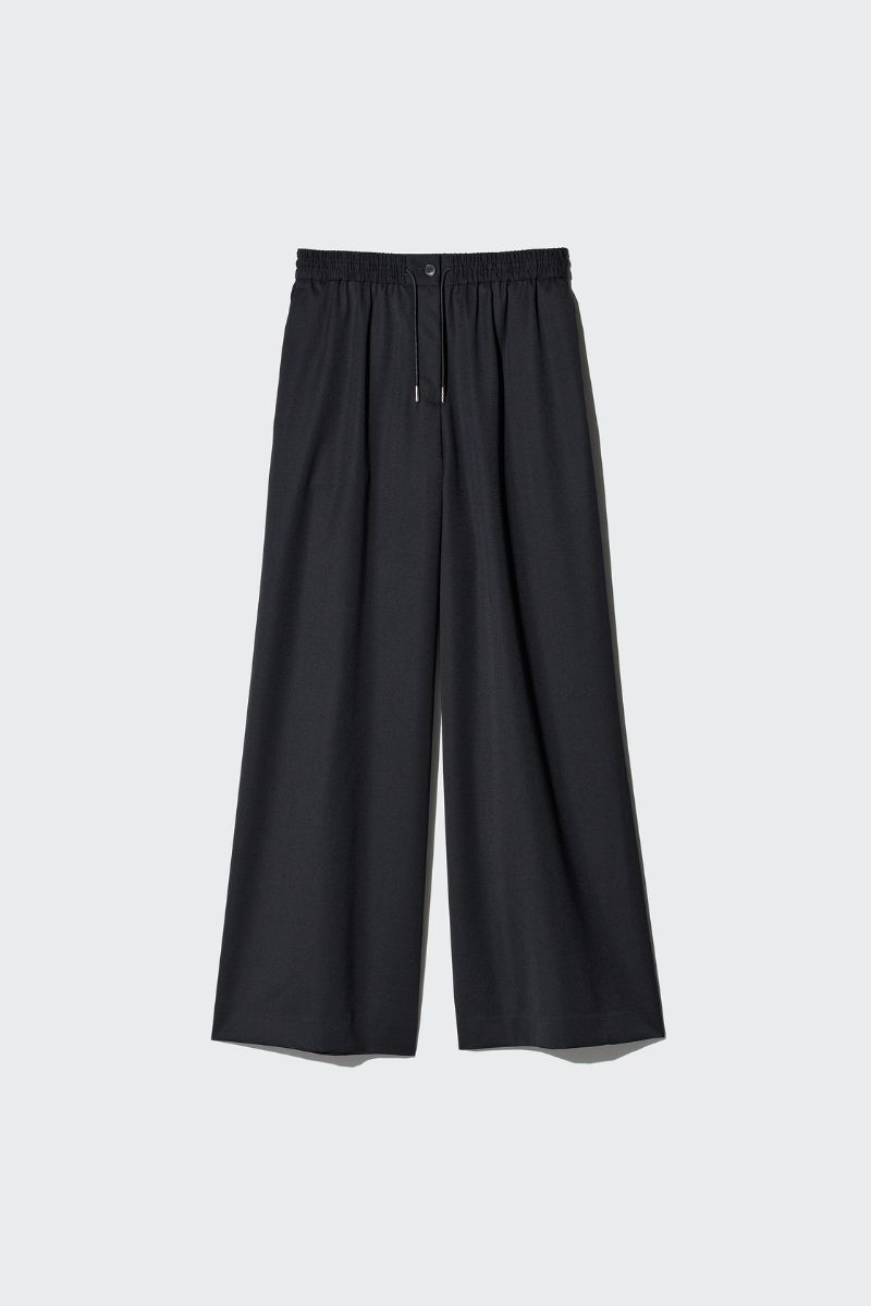 すとんと落ちるウール混素材なので、脚のラインを拾わずにすっきり見え。さらに、お腹いっぱい食べても苦しくないって最高! イベントシーズンの味方「ウエストゴム」仕様です。コード付きのウエストだから、ゴムでもこなれた印象に。ストレスフリーなのに、スラックスのようなきちんと感はキープしてくれる着回し力抜群のワイドパンツです。