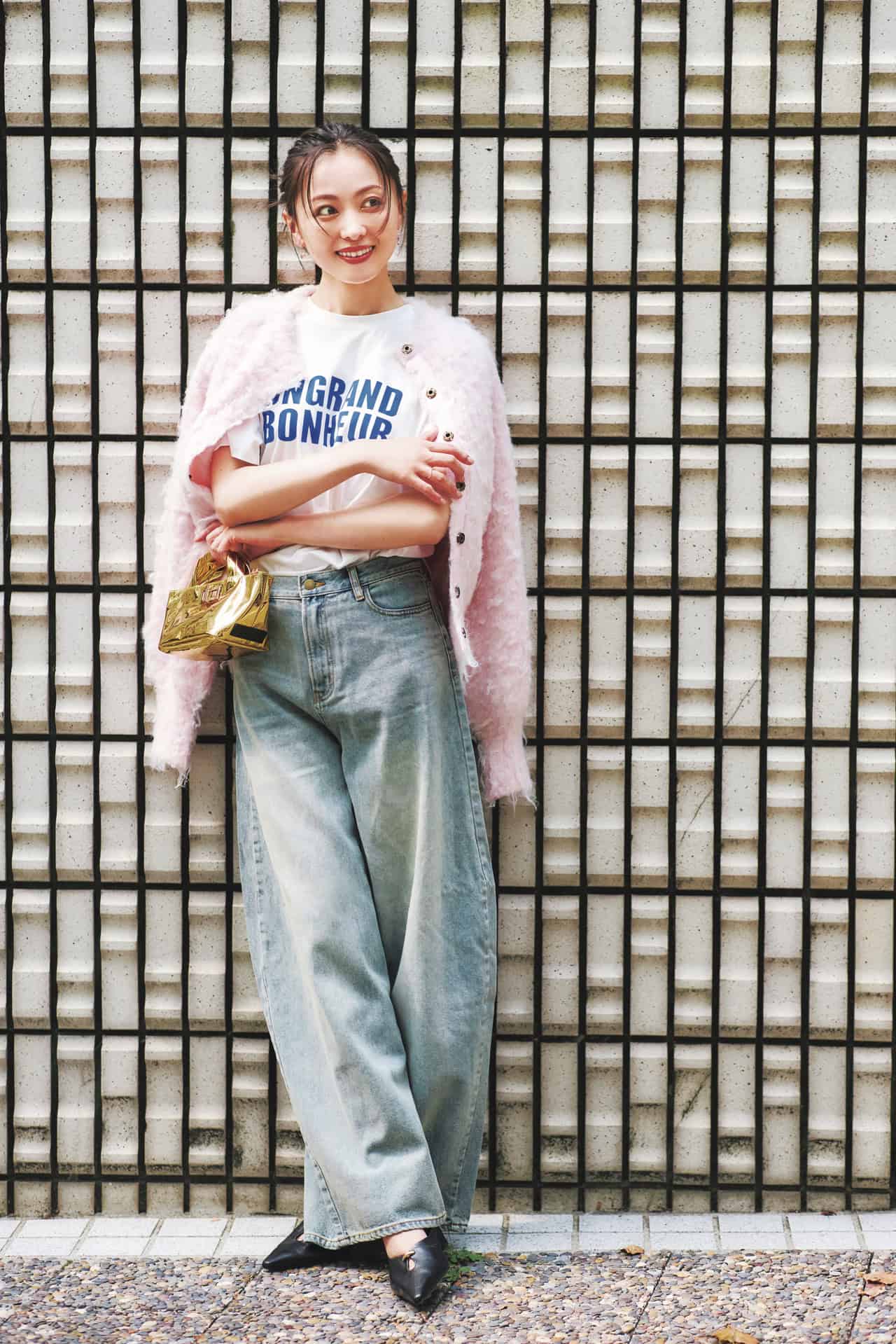 ¥29,700(サクラ/インターリブ)ピンクパンツ¥30,800(ウィム ガゼット/ウィム ガゼット 玉川髙島屋S・C店)スカーフ¥16,500(マニプリ)バッグ¥152,900ブーツ¥135,300(ともにトッズ/トッズ・ジャパン)ピアス¥48,400(CALLMOON/ショールーム セッション)ネックレス¥110,000(SOPHIE BUHAI/エスケーパーズ アナザーワールド)バングル¥77,000(NOAARK/エスケーパーズオンライン)