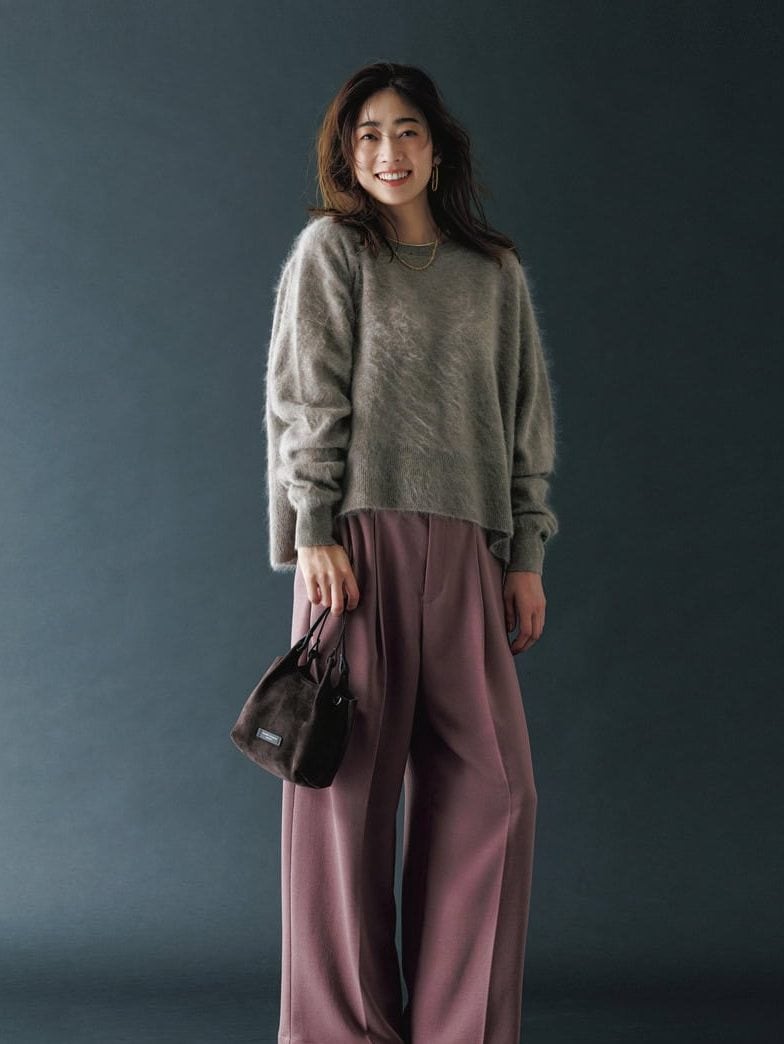 パンツ¥29,700(ル フィル)ニット¥49,500(ザ シンゾーン/シンゾーン ルミネ有楽町店)バッグ¥121,000〈ルッツ モリス〉靴¥59,400〈ペリーコ〉(ともにアマン)ピアス¥66,000(カラットアー/イセタンサローネ東京)ネックレス¥33,000(マリハ)リング¥24,200(ココシュニック オンキッチュ/ココシュニック)