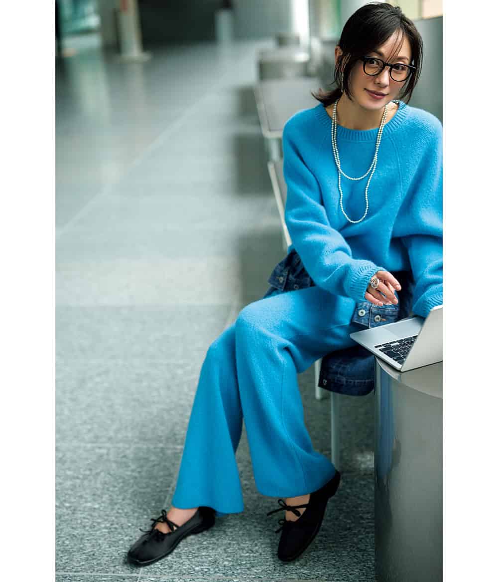 バレエシューズ¥12,650(ル タロン/ル タロン 有楽町マルイ店)ニット¥93,500パンツ¥58,300(ともにニアー ニッポン/ニアー)腰に巻いたデニムジャケット¥20,900(アルページュストーリー)メガネ¥42,900(プロポ/プロポデザイン)ピアス¥22,000ネックレス[長]¥101,640リング¥19,470〈すべてバルブス〉 ネックレス[短]¥33,000〈アルポ〉(すべてズットホリック)