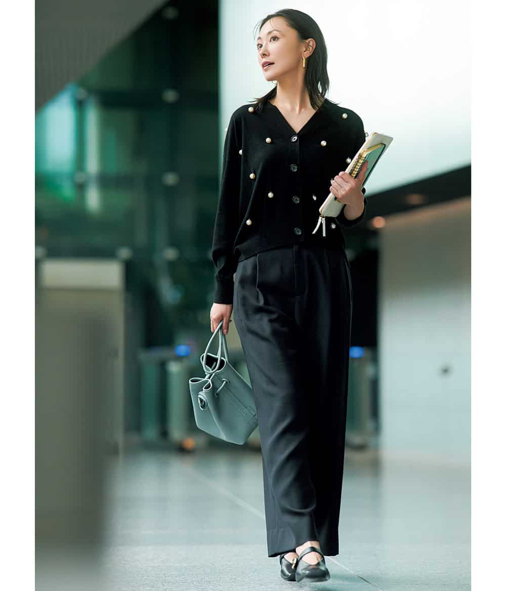 カーディガン¥97,900(カオス/カオス丸の内)カットソー¥12,980(チャンピオン/ヘインズブランズ ジャパン カスタマーセンター)パンツ¥33,000(アストラット/アストラット 新宿店)バッグ¥14,300(ツル バイ マリコ オイカワ)パンプス¥40,700(チェンバー/クルーズ ショールーム)ピアス¥30,800(ココシュニック)ネックレス¥44,000(ブランイリス/ブランイリス トーキョー)
