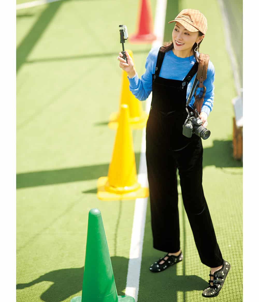シューズ¥30,800(ツル バイ マリコ オイカワ)ニット¥14,300(emmi/emmi ニュウマン新宿店)オールインワン¥61,600(ロンハーマン)バッグ¥18,700(ノマディス/ノーベルバ)キャップ¥7,700(ラ・メゾン・ド・リリス/アルアバイル)イヤリング¥33,000(ブランイリス/ブランイリス トーキョー)リング¥51,700(バルブス/ズットホリック)