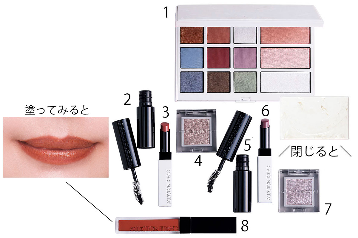異なる質感を組合わせて洒落感のある印象に。1 アディクション アイ & ブラッシュ パレット“アンアースド ラスター” ¥11,000、2.3.4 アディクション スター カラー キット マリアージュ ¥6,490、5.6.7 アディクション スター カラー キット バジー ¥6,490、8 アディクション リップ セラム ティント 103 ¥3,520(すべてADDICTION BEAUTY)