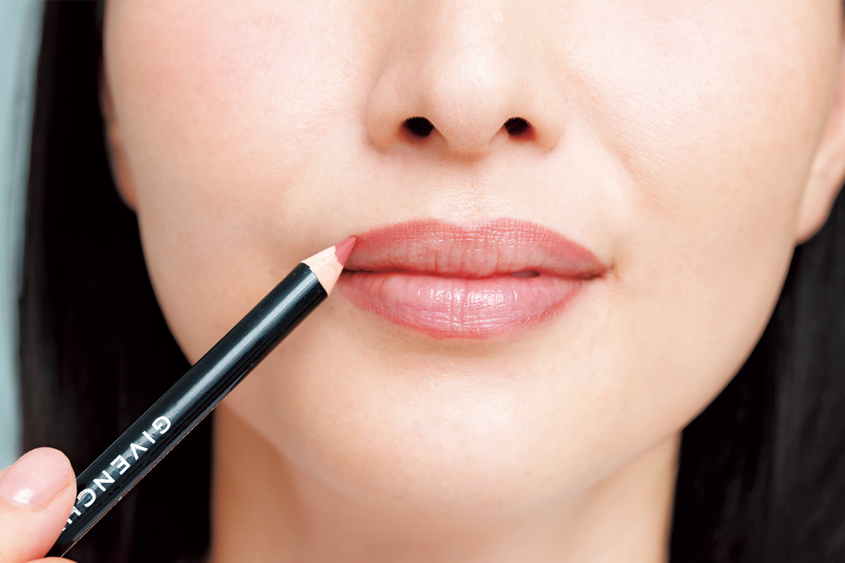 曖昧な輪郭、薄くなった上唇、間延びした人中。口周りの変化は、顔の立体感までも左右します。リップライナーで輪郭を整えてメリハリを与えて。特に上唇を少し大きめに描きます。色はピンクベージュが万能。