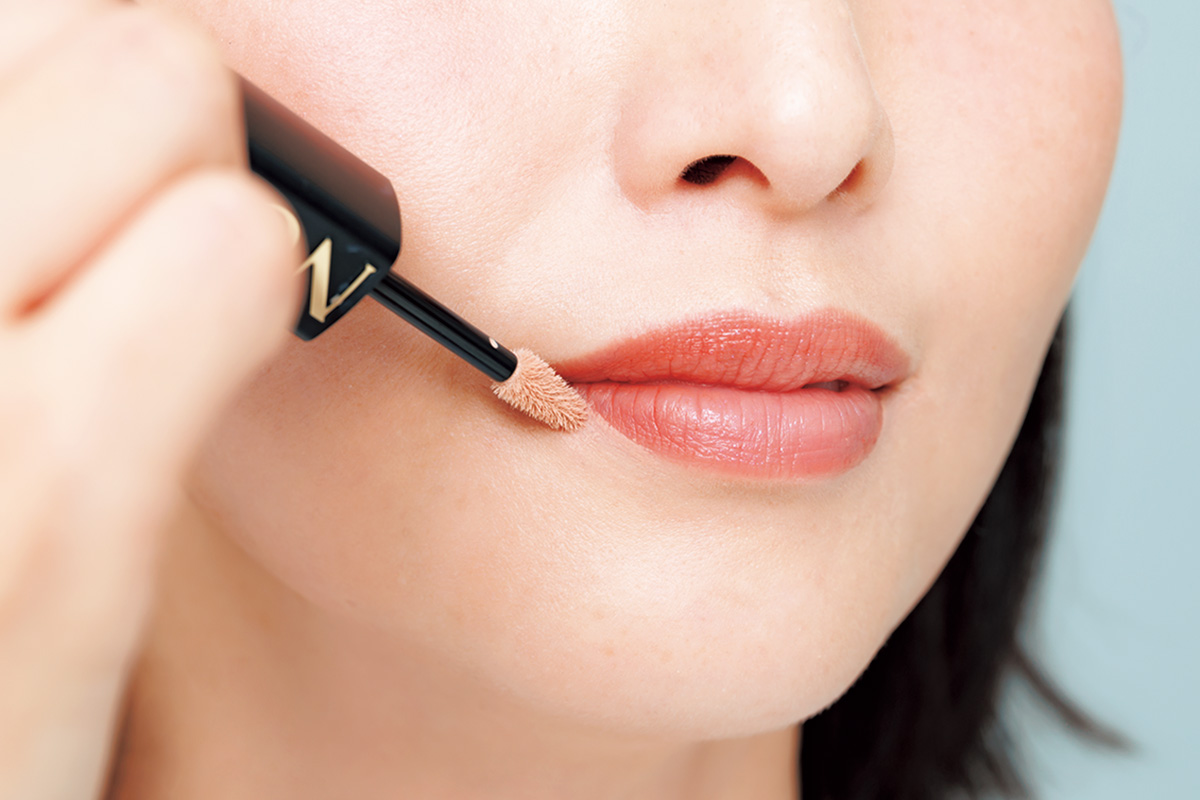 口周りのもたつきは、ほうれい線を直接触るより、鼻周りのくすみを整えるほうがキレイ。コンシーラーを必要な場所に少量を塗布。口角もリフトアップ。