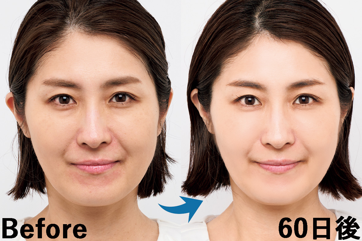 ゆるんでいたフェイスラインや下半顔がスッキリして顎先もキュッとしました。専用のアミノプロテイン クリームを併せて使用したことで、肌が明るくハリもUP。目立っていたクマも軽減し、若々しい肌印象に変化。