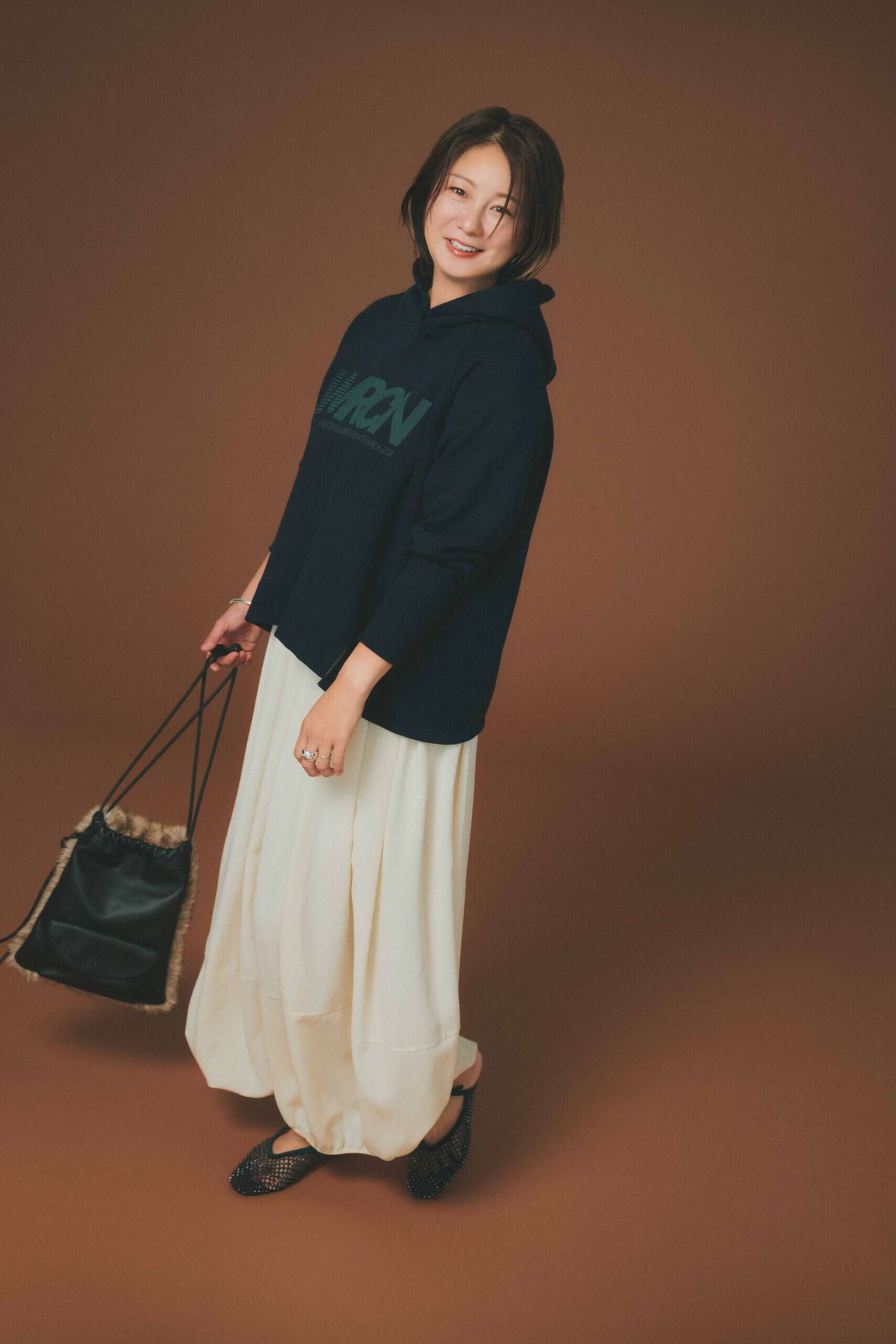 スカート¥26,400(スタニングルアー)パーカ¥19,800(アメリカーナ×マイカアンドディール/マイカアンドディール)バッグ¥39,600(ヴァジック/ヴァジックジャパン)シューズ¥19,800(ル タロン グリーズ)ピアス¥3,780(アビステ) バングル¥22,000(ワンエーアールバイウノアエレ/ウノアエレ ジャパン)リング¥22,000(ココシュニック オンキッチュ/ココシュニック)