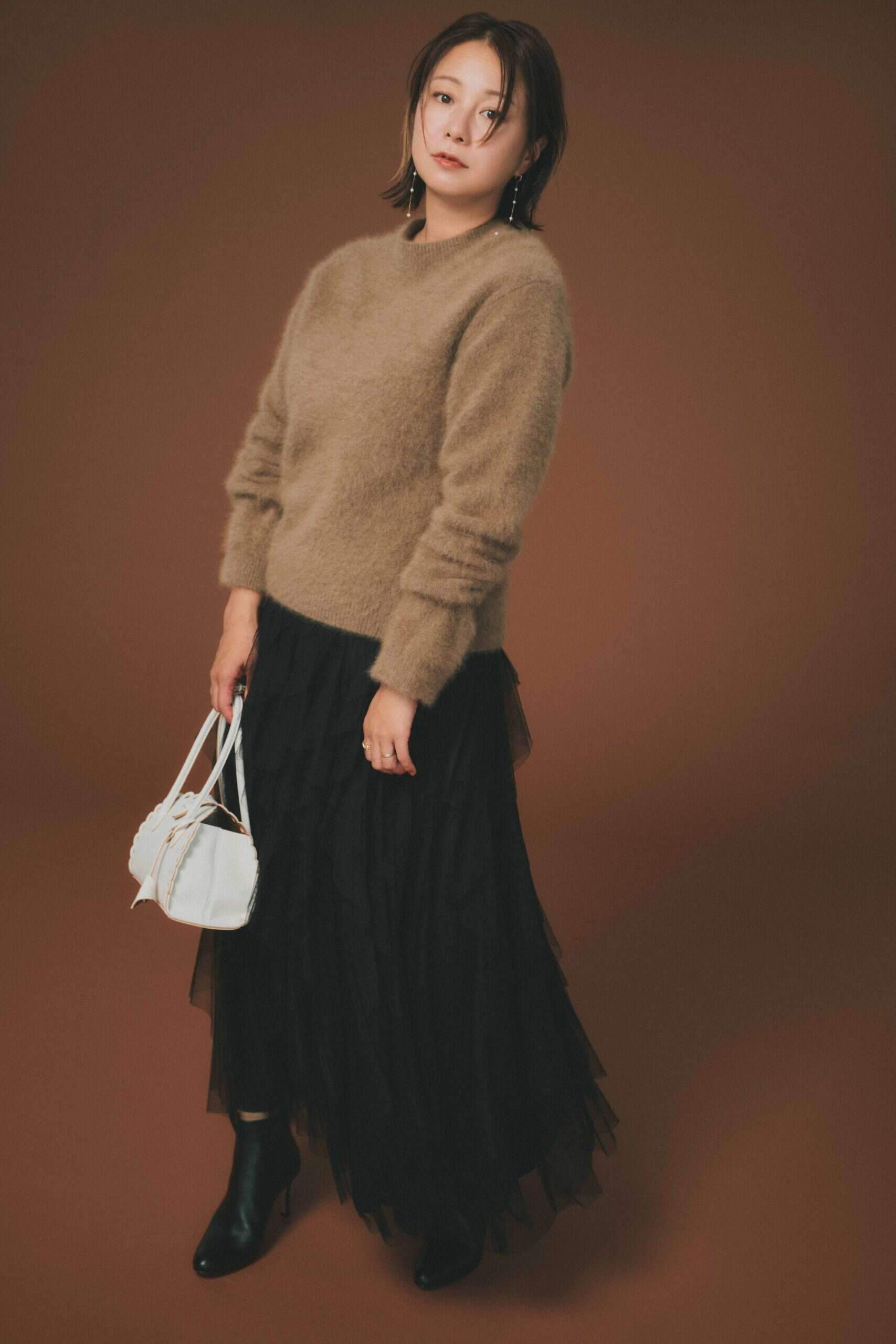 主人と結婚記念日のお祝いでディナーに行くのは、年に1度の楽しみ。ママスイッチをOFFにしてくれるチュールスカートは、黒を選べばシックにまとまって気恥ずかしさもクリア。控えめなボリュームのランダムチュールだから、さりげなくモードな印象に。女っぽさを意識したキャメルのファーニットでリッチ感を漂わせて。