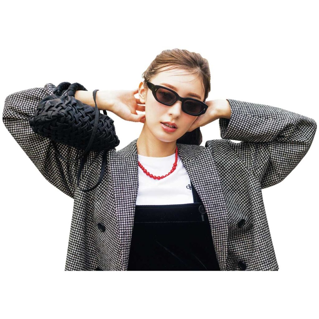 ジャコット¥44,000(カデュネ プレスルーム)Tシャツ¥7,480(GOOD ROCK SPEED╱グッドスピード)メガネ¥44,000(YVMIN╱NUBIAN)ネックレス※短¥24,200※長¥35,200(ともにquip queint╱フーブス)リング※10点セット¥15,120(アビステ)