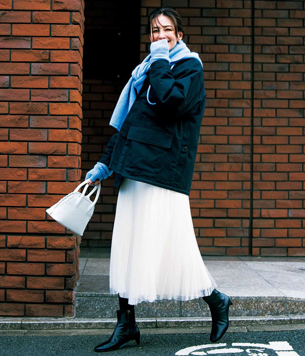 木枯らしの日も防風アウターと揺れるスカートで心晴れやか。
