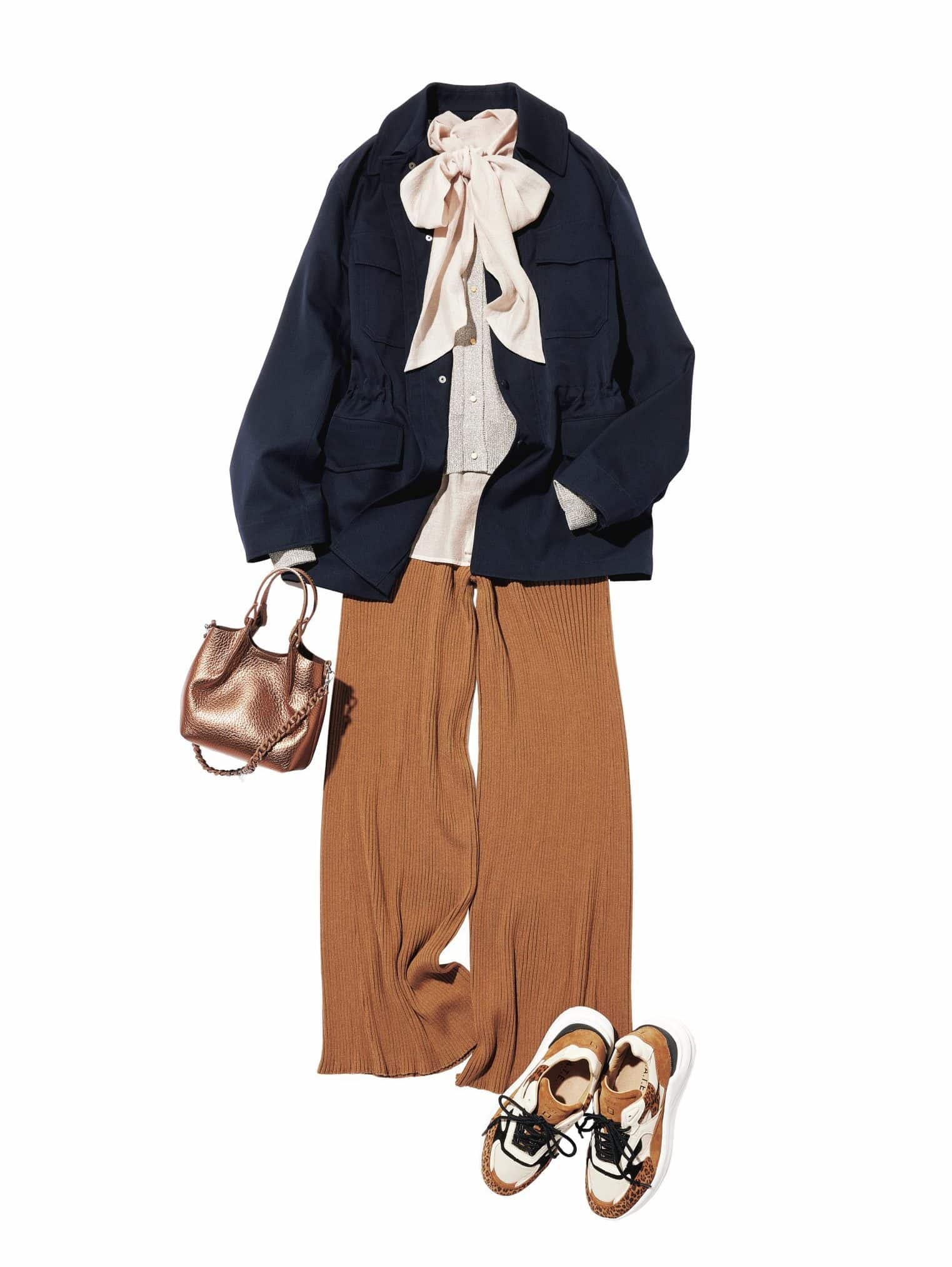 ミリタリージャケット¥77,000(ロエフ/エイチ ビューティ&ユース)カーディガン¥31,900(ebure/リトルリーグ インク)ボウタイブラウス¥25,300(ウィム ガゼット/ウィム ガゼット 玉川髙島屋S・C店)パンツ¥55,000(ハイク/ボウルズ)バッグ¥40,700ストラップ¥9,900(ともにジャンニ キアリーニ/ジャンニ キアリーニ 銀座店)スニーカー¥44,000(デイト/ティースクエア プレスルーム)