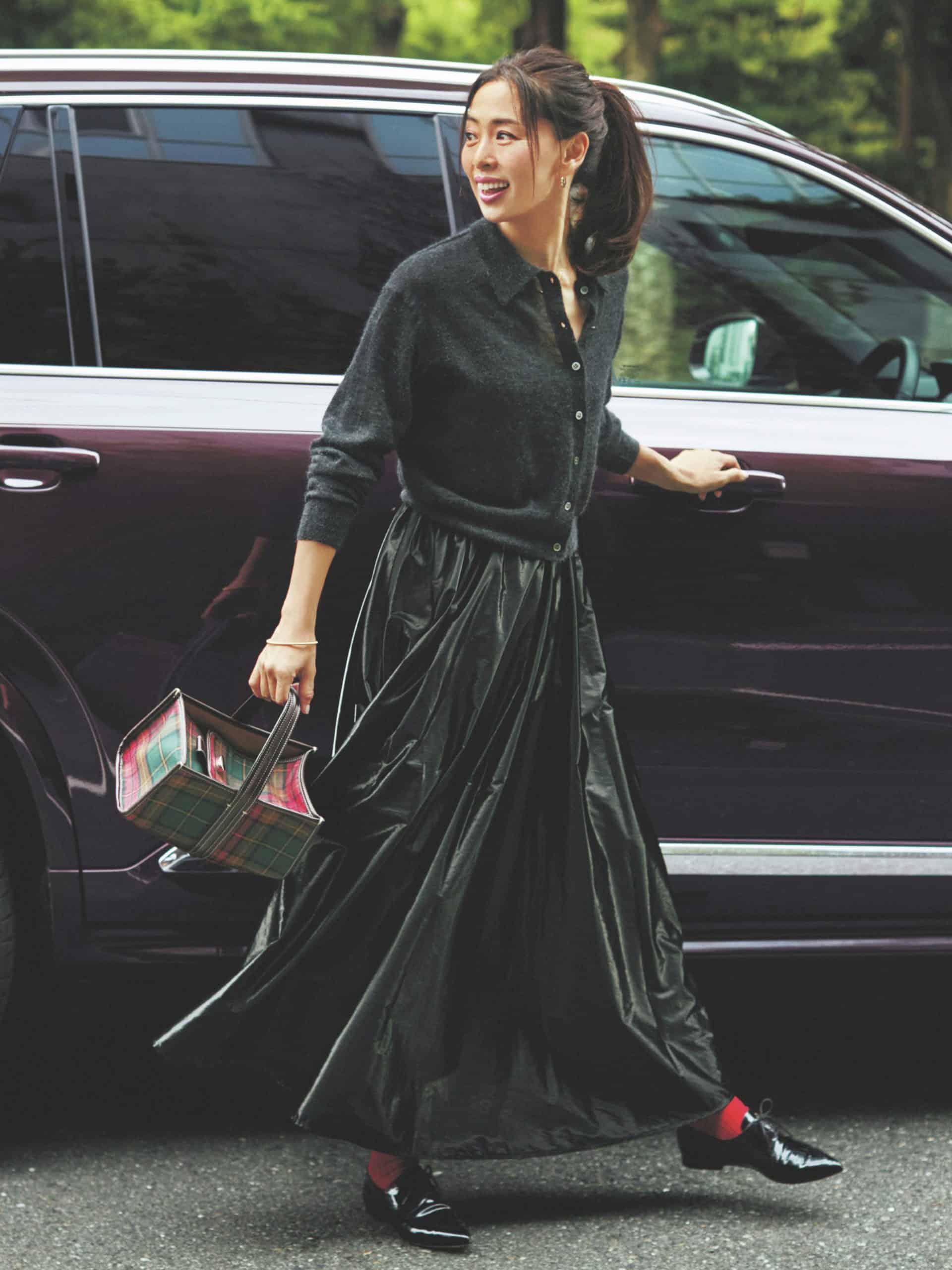 ニット¥42,900(サクラ/インターリブ)サテンスカート¥14,300(MARW/ユナイテッドアローズカスタマーサービスデスク)バッグ¥42,900(アバケーション)シューズ¥73,700(ネブローニ)ソックス¥3,630(パンセレラ/真下商事)ネックレス¥19,800(シャルロット ウーニング/フラッパーズ)ピアス¥38,500ブレスレット¥35,200(ともにプラウ)